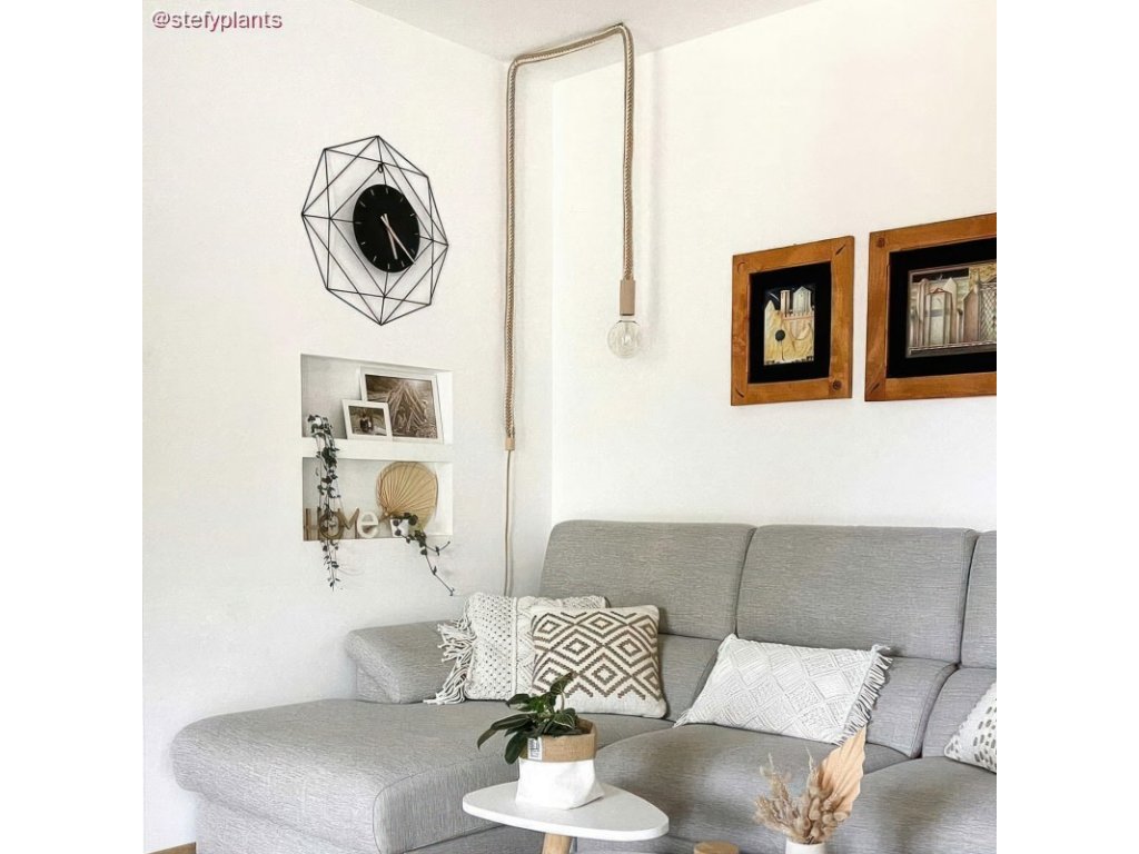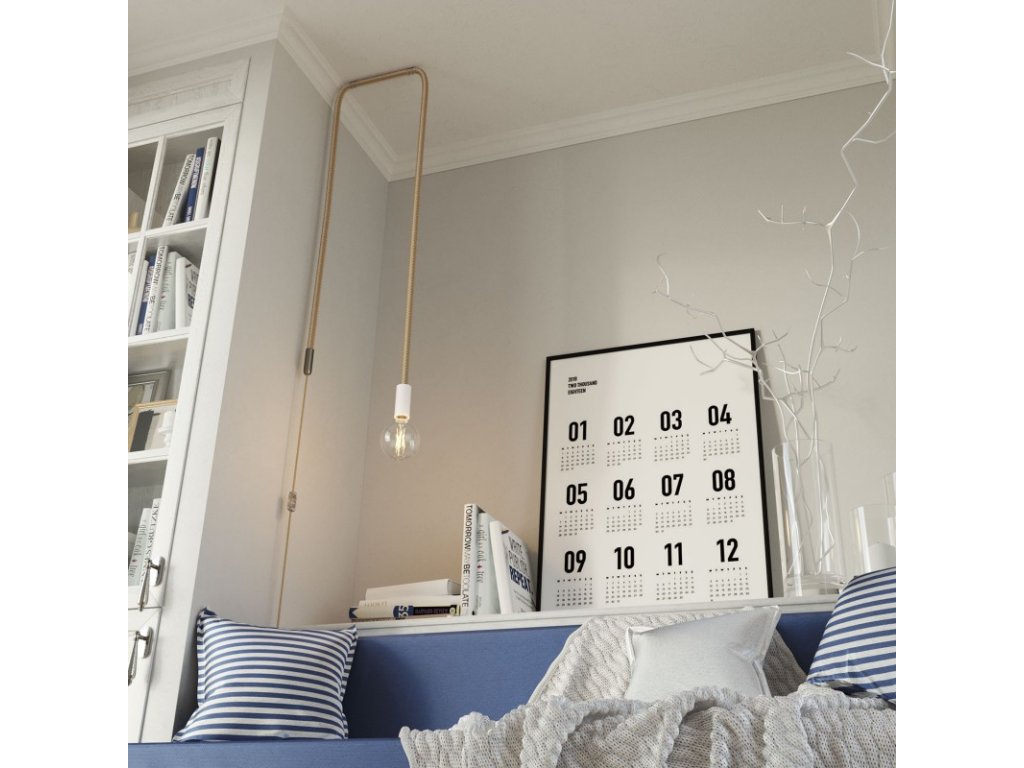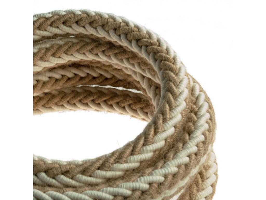Textilný elektrický kábel pre svietidlá sme premenili na lanový kábel. Tento kábel z jutového lana 2XL je vybavený dvojitým poťahom: okrúhly elektrický kábel pokrytý jutou RN06 je ešte raz opletený špirálovým poťahom z juty a bielej bavlny, čím dosahuje vonkajší priemer 24 mm. Nevzdávajte sa krásy lanového kábla 2XL! Okrúhly kábel 2x0,75 pokrytý jutou RN06 vedie vo vnútri ďalšieho špirálovo opleteného kábla: preto môžete s káblom zaobchádzať ako s akýmkoľvek iným káblom bez toho, aby ste sa museli starať o to, ako ho pripojiť. Môžete použiť lanový kábel 2XL pokrytý jutou a bavlnou, ktorý ladí k stropnému baldachýnu a objímke z prírodného alebo lakovaného dreva. Vytvoríte tak závesné svetlo s veľkým efektom. 100% vyrobené v Taliansku.