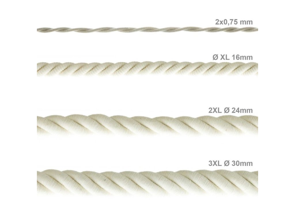 Elektrický kábel sa premenil na elektrické lano. Elektrický kábel je potiahnutý jemnou vatovinou a bavlnou na dosiahnutie efektu lana s priemerom 24 mm. Tento 2XL elektrický kábel v spojení s našou novou drevenou objímkou a dreveným stropným baldachýnom môžete použiť na vytvorenie skutočne jedinečného svietidla. 100% Vyrobený v Taliansku.