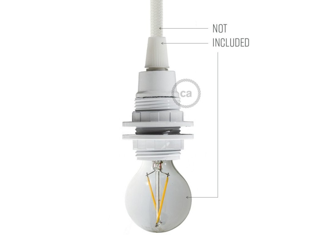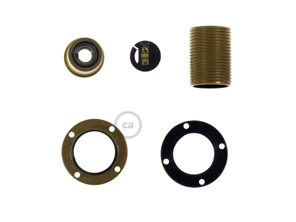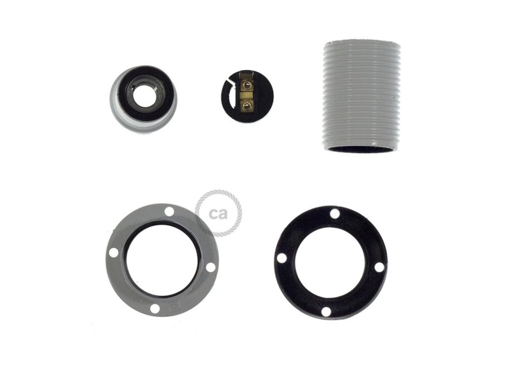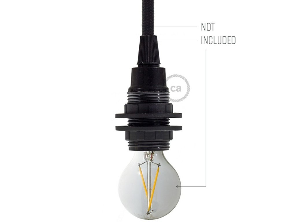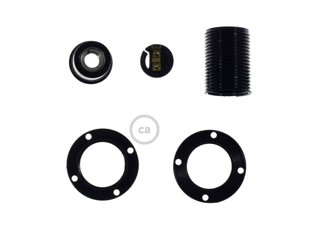 Bakelitová objímka E14 s dvoma krúžkami pre tienidlo je užitočná na zostavenie nástennej, stolnej alebo stropnej lampy, ktorú môžete doplniť o tienidlo. Bakelit bol pomenovaný po svojom vynálezcovi a jedná sa o termosetovú živicu, ktorá nám pripomína telefóny, rádiá a ďalšie predmety z 50. a 60. rokov. Je to ľahký a odolný materiál: pokiaľ je natretý, stáva sa veľmi lesklým!
