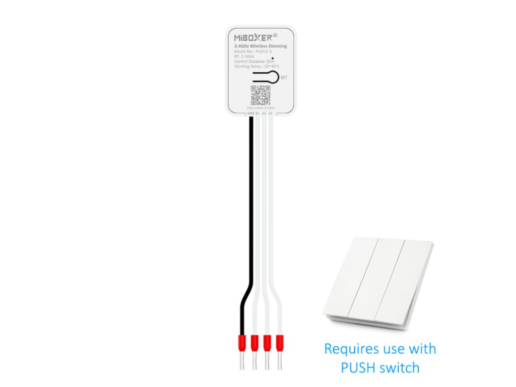 - k stmievaču je potrebný PUSH spínač, ktorý umožňuje bezdrôtové ovládanie jasu a zapínanie/vypínanie pripojených svetiel