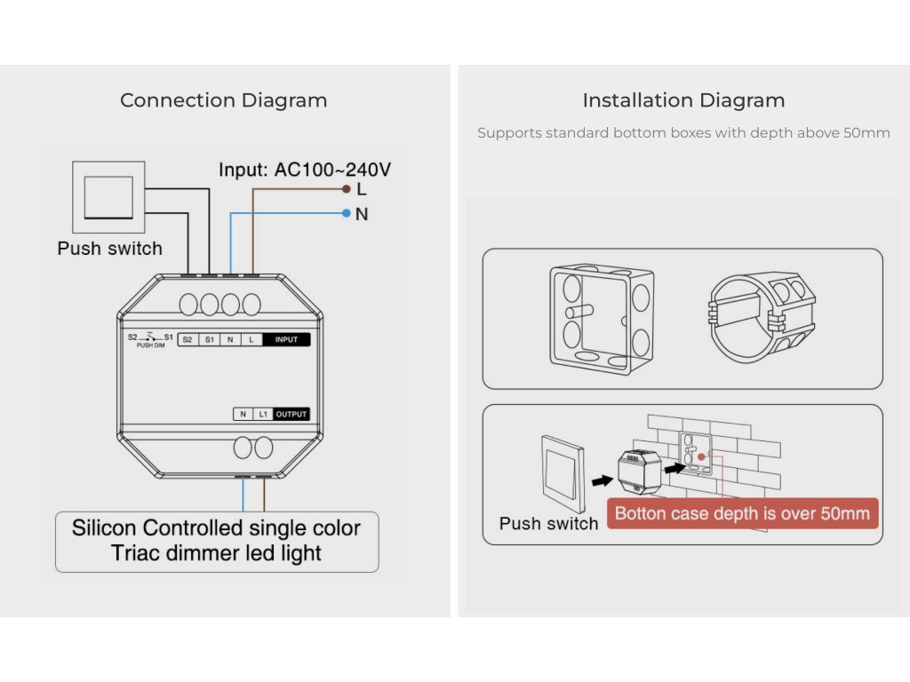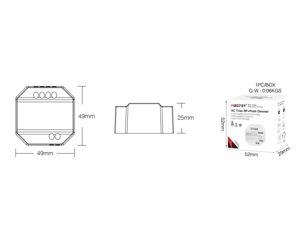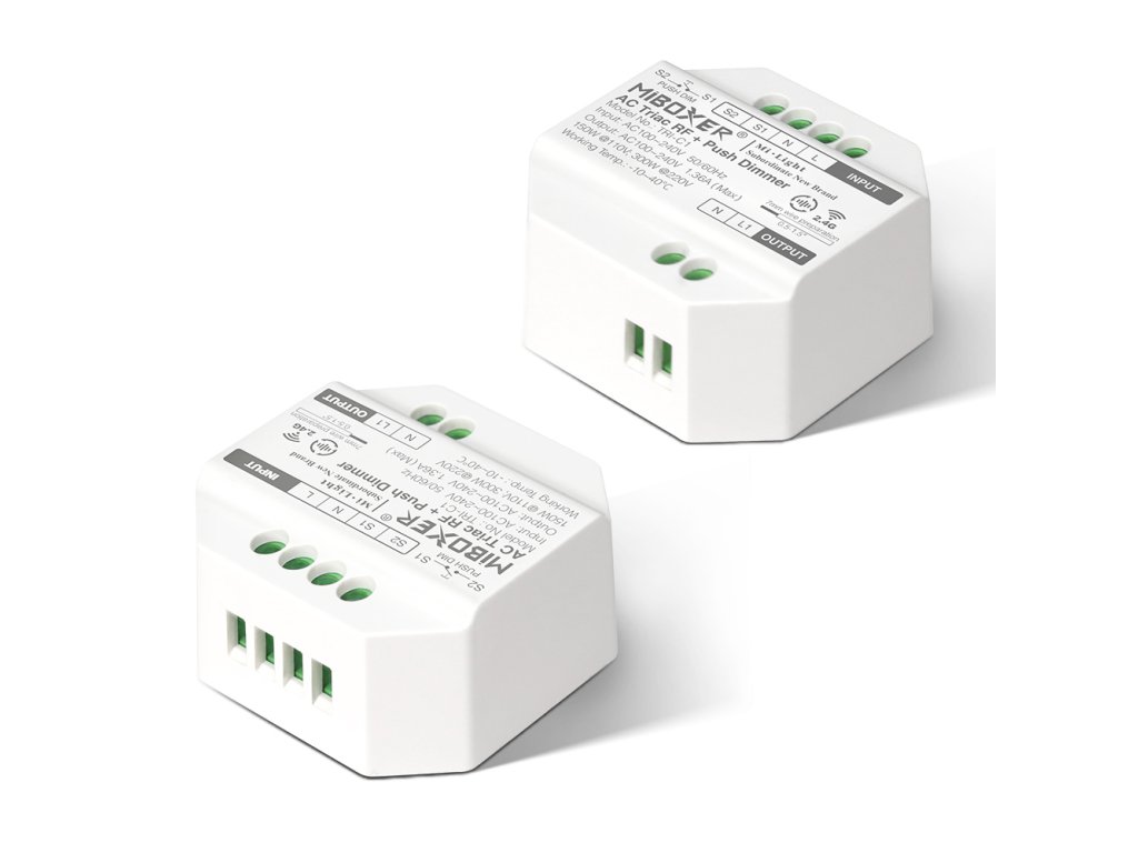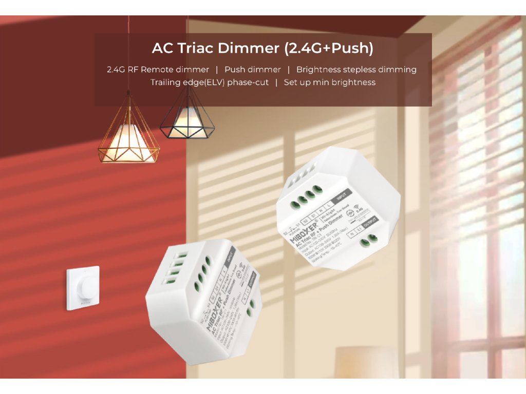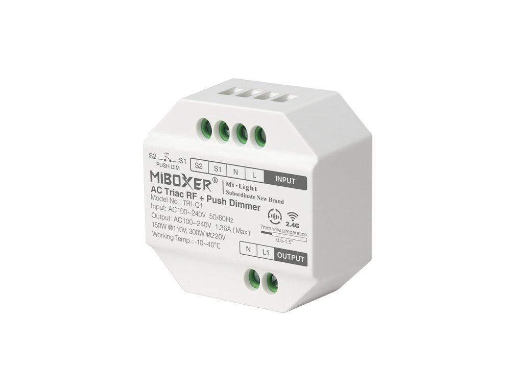 Prijímač - stmievač pre riadenie svetelných zdrojov s triakovou technológiou. Je určený na stmievanie LED svietidiel, klasických vláknových a halogénových žiaroviek. Má možnosť dvojakého riadenia - buď bezdrôtovo pomocou 2,4 GHz signálu alebo pomocou externého tlačidla (spínanej fázy).