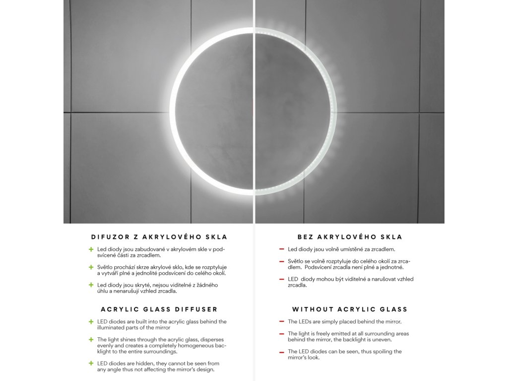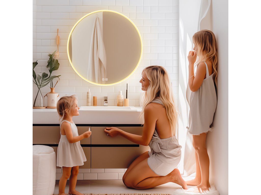 Kulaté zrcadlo s rámem a s celoobvodovým podsvícením pro dokonalé a rovnoměrné osvětlení. Zrcadlo se ovládá dvěma dotykovými podsvícenými senzory, které umožňují změnu barvy podsvícení, nastavení intenzity osvětlení (stmívání) a disponují paměťovou funkcí pro uložení posledního nastavení. Kromě toho lze zrcadlo ovládat i pomocí nástěnného vypínače, což zvyšuje jeho flexibilitu a pohodlí použití. Ke zlepšení kvality podsvícení je použit difuzor z akrylového skla, který zajišťuje rovnoměrný a měkký rozptyl světla. LED diody jsou elegantně integrovány přímo v difuzoru, což zvyšuje intenzitu světla a zaručuje jeho jednotné rozprostření po celé ploše podsvícení. Výsledkem je příjemné a rovnoměrné osvětlení bez viditelných bodových zdrojů. Zrcadlo využívá nejmodernější LED čipy SMD 2835, které jsou známé svou vysokou svítivostí, energetickou úsporností a dlouhou životností. Hustota čipů 96+96/m (192/m), životnost 50 000 hodin. Parametry LED: Survival Factor = 1, Lumen Maintenance Factor 0,99 a Flicker Metric 0,02, pak zajišťují stabilní, bezblikavé a dlouhodobě konzistentní osvětlení. Nosná konstrukce zrcadla je vyrobena z masivního hliníkového rámu o rozměrech 32x19 mm, který zajišťuje vysokou pevnost a stabilitu. Stejně tak je z hliníku vyroben kryt zdroje a všech elektronických součástek. Sklo o tloušťce 5 mm je opatřeno bezpečnostní fólií, která chrání před zraněním v případě rozbití. Zrcadlo navíc disponuje stupněm ochrany proti vlhkosti IP44, což zaručuje spolehlivost i v prostředí s vyšší vlhkostí. Zrcadlo splňuje všechny české normy a je opatřeno českým certifikátem CE, který zaručuje jeho kvalitu a bezpečnost. Nabízí flexibilní možnosti upevnění, a to jak vertikálně, tak horizontálně, a je dodáváno včetně kompletní montážní sady a kabelové spojky s ochranou IP44. Pro zajištění bezpečné přepravy je zrcadlo pečlivě zabaleno a připraveno k expedici prostřednictvím kurýrní služby. Ovládání: Dotykové senzory + možnost ovládání nástěnným vypínačem Nastavení barvy podsvícení: Ano Barva podsvícení: Nastavitelná v rozsahu 3000–6500 K (od teplé po studenou bílou) Funkce stmívání: Plynulé stmívání Paměť nastavení: Ano Konstrukce podsvícení: K rovnoměrnému rozptylu světla zrcadlo disponuje difuzorem z akrylového skla Integrace LED: LED diody jsou integrovány přímo v difuzoru LED čip: Nejmodernější LED čipy SMD 2835 LED pásek - hustota čipů: 192/m (96+96/m) Životnost LED čipů: Až 50 000 hodin Kvalita osvětlení LED: Survival Factor = 1; Lumen maintenance factor = 0,99; Flicker metric = 0,02 Materiál: Zrcadlové sklo, hliník Materiál konstrukce: Rám zrcadla a kryt zdroje jsou vyrobeny z hliníku Tloušťka skla: 5 mm Ochrana při rozbití: Bezpečnostní fólie Stupeň ochrany: IP 44 Certifikace: Český certifikát CE Umístění: Montáž na stěnu Možnost upevnění vertikálně i horizontálně Montážní příslušenství: Součástí balení je montážní sada a kabelová spojka s ochranou IP 44 Obal: Zabalené pro přepravu kurýrní službou Napětí: Vstupní napětí 220-240 V Výstupní napětí 12 V Příkon: 43 W, světelný tok: 3096 lm Rozměr: v: 900 mm š: 35 mm d: 900 mm Hmotnost: 12,6 kgDodatočné parametre