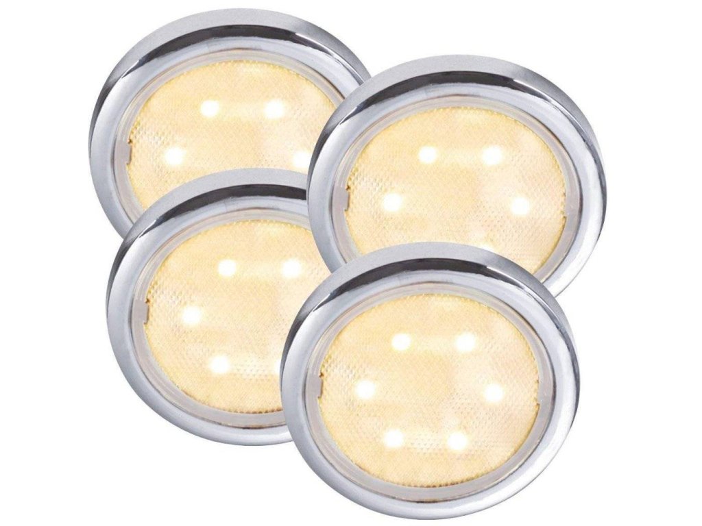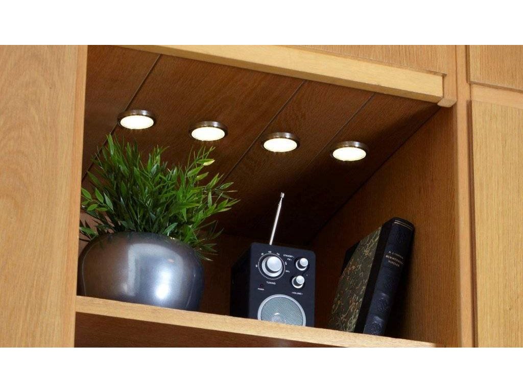 Vstavané bodové svetlá Lismore 4-kit v chrómovom vzhľade. Bodové svetlá majú integrované LED žiarovky. Vhodné pre montáž na horné skrinky v kuchyni na zaistenie správneho pracovného svetla pri kuchynskom stole.