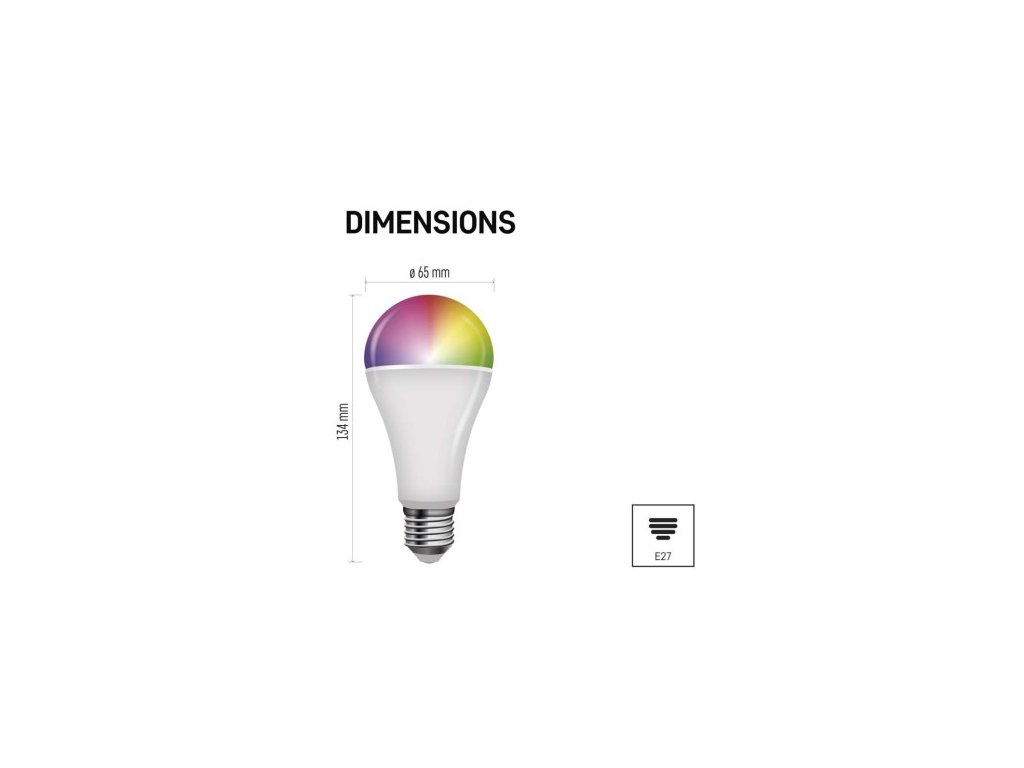 farba svetla: RGB|energetická trieda: F|index podania farieb (CRI): 80|kompatibilita: EMOS GoSmart, TUYA, LIDL, Smartlife|náhrada za žiarovku: 94 W|napätie: 230 V~/50 Hz|notifikácia do mobilnej aplikácie: áno|ovládanie hlasovými asistentmi (uchytenie žiarovky): E27|počet čipov: neuvádza sa|počet spínacích cyklov: 15 000|podporované OS: Android, iOS|prenosová frekvencia: ZigBee 2,4 GHz|príkon: 14 W|predajný obal: 1 ks, škatuľka|protokol: 65 × 65 × 134 mm|stmievateľná: áno|svetelná účinnosť: 100 lm/W|svetelný tok: 1 400 lm|technológia: LED|teplota chromatickosti: 2 700–6 500 K|tvar: A65|typ čip| vyžarovanie: 200°|záručná doba: 2 roky|životnosť: 20 000 hodínDodatočné parametre