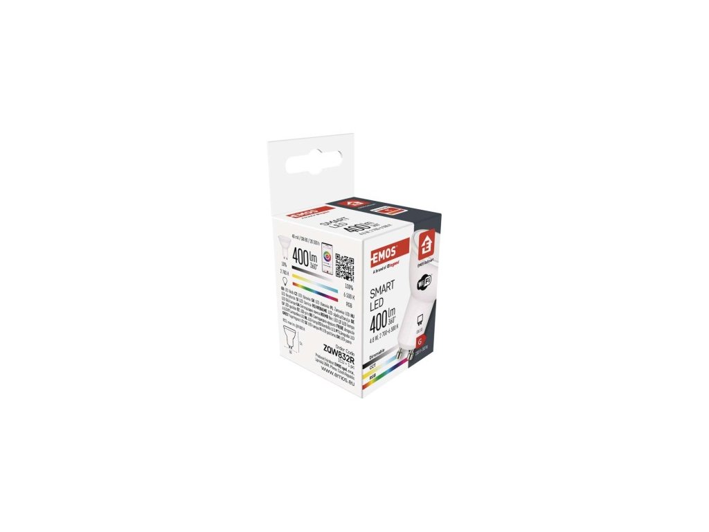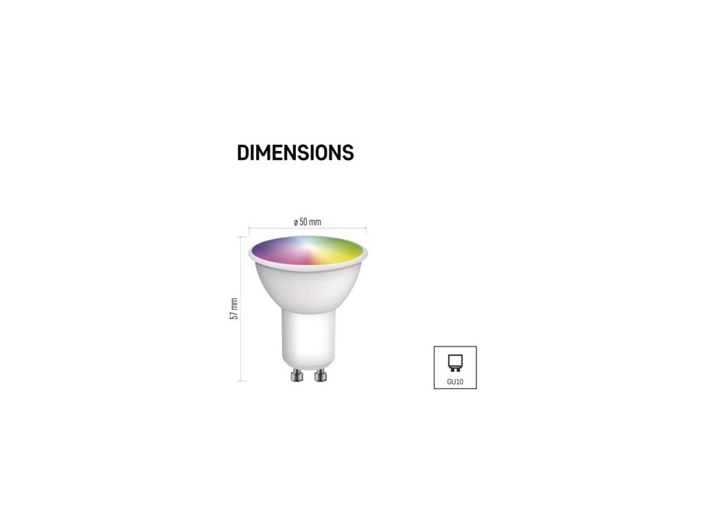 farba svetla: RGB|energetická trieda: G|index podania farieb (CRI): 80|kompatibilita: EMOS GoSmart, TUYA, LIDL, Smartlife|náhrada za žiarovku: 35 W|napätie: 230 V~/50 Hz|notifikácia do mobilnej aplikácie: áno|ovládanie hlasovými (uchytenie žiarovky): GU10|počet čipov: neuvádza sa|počet spínacích cyklov: 15 000|podporované OS: Android, iOS|prenosová frekvencia: 2,4 GHz WIFI|príkon: 4,8 W|predajný obal: 1 ks, krabička|protokol: Wi-Fi:| 50 × 56,5 mm|stmievateľná: áno|svetelná účinnosť: 83 lm/W|svetelný tok: 400 lm|technológia: LED|teplota chromatickosti: 2 700–6 500 K|tvar: MR16|typ čipov: SMD|úč| 120°|záručná doba: 2 roky|životnosť: 20 000 hodínDodatočné parametre