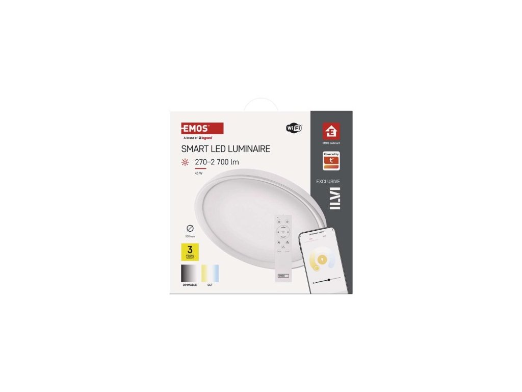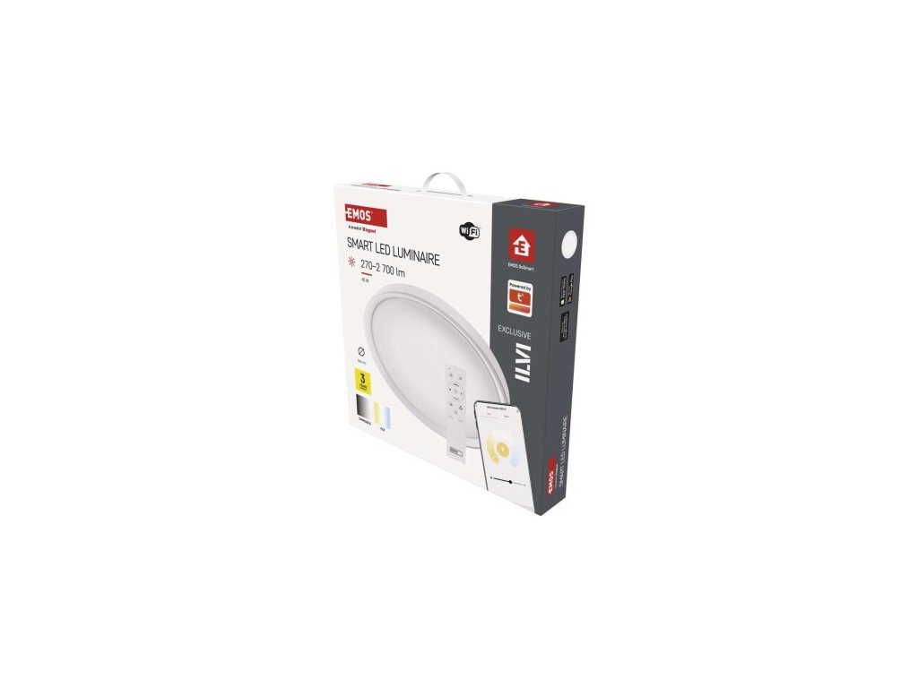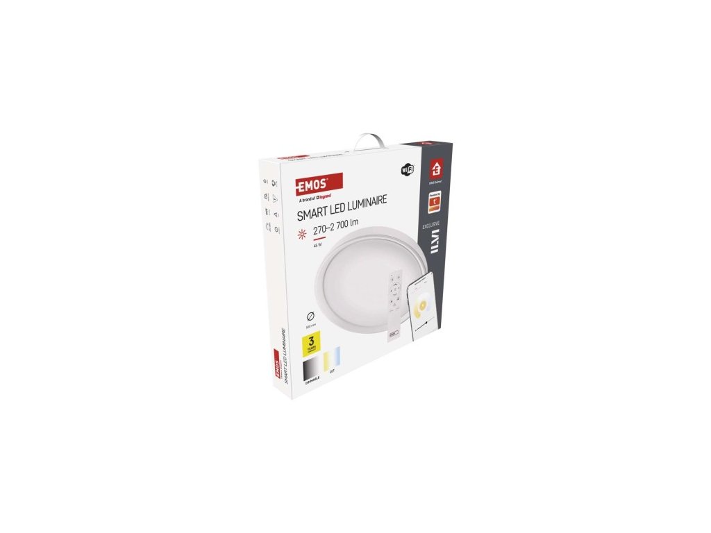 farba svetla: teplá biela–studená biela|farba tela: biela|diaľkový ovládač: áno (2× AAA, R03)|ďalšie funkcie: –|do chodby a na schodisko: áno|do dielne a garáže: ne|do kancelárie: áno|do kúpeľne: ne|do kuchyne: áno|do oku nemá senzor|flicker-free: áno|frekvencia: 50/60 Hz|index podania farieb (CRI): Ra > 80|jazyky aplikácie: EN, SK, SK, PL, DE, HU, SI, FR, + 60 ďalších jazykov|kategória: EXCLUSIVE|kompatibilita: EMOS GoSmart, DL systém|krytie: IP20|materiál difúzora: plast (PMMA)|materiál LGP: neuvádza sa|materiál tela: oceľový plech|montážny otvor: neuvádza sa|možnosť stmievania: áno|náhrada za žiarovku: 160 W|napätie: 220–240 V|na záhradu a bal –|ovládanie hlasovými asistentmi: áno (Amazon Alexa, Google Assistant)|podporované OS: Android, iOS|pohybový senzor: neuvádza sa|prenosová frekvencia: 2,4 GHz Wi-Fi|príkon: 45 W|predajný obal: 1 ks, krabica|protokol: Wi-Fi|prud:| 500 × 70 mm|svetelná účinnosť: 60 lm/W|svetelný tok: 2 700 lm|teplota chromatickosti: 2 700–6 500 K|tvar: kruh|typ difúzora: mliečny|typ svietidla: klasické svietidlo|účinník: > 115°|umiestnenie: stropný/nástenné|výstupný prúd zo zdroja: 175 mA|záručná doba: 3 roky|zdroj svetla: LED|životnosť: 30 000 hodín|spôsob montáže: prisadenéDodatočné parametre