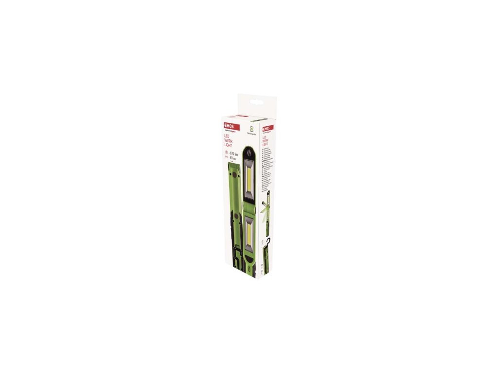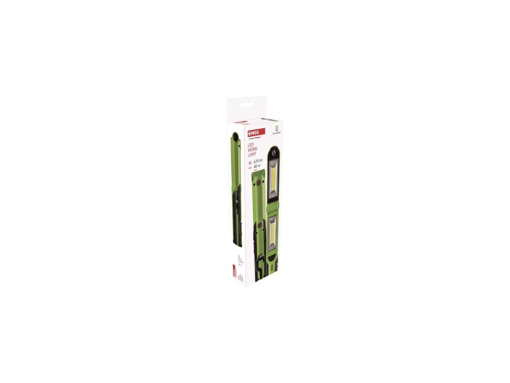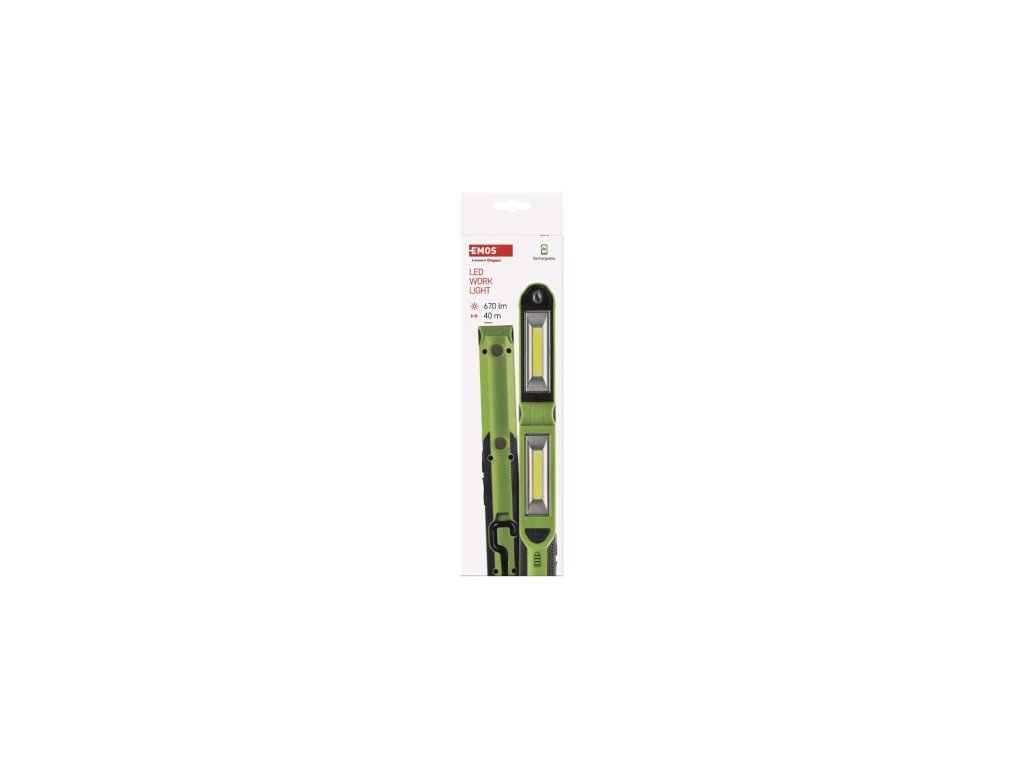 farba: čierno-zelená|batéria súčasťou balenia: áno|doba nabíjania: 3 h|doba svietenia: 2–10 h|doba svietenia detail: 1× COB LED 100 % – 3,5 h, 2× COB LED 100 % – 2,5 h, LED 100 % – 10 h | m, 2× COB LED 100% - 35 m, LED 100% - 40 m|fokus: ne|hmotnosť: neuvádza sa|LED indikácia nabíjania: áno|LED indikácia stavu akumulátora: áno|materiál: ABS + TPR + guma|maximálny dosvit: 40 m|najmaximálny áno|napájanie: Li-Ion akupack|nárazuvzdornosť: ne|počet režimov svietenia: 3|príslušenstvo: USB kábel|predajný obal: 1 ks, krabica|režimy svietenia: 1× COB LED 100%, 2× COB LED 100%, LED 100%| power bank, funkcia rýchleho vypnutia, funkcia ochrany batérie|svetelný tok: 1× COB LED 100% – 340 lm, 2× COB LED 100% – 670 lm, LED 100% – 55 lm|typ batérie: 2 200 mAh/3,7 V|typ napájacieho 1× hák, 4× magnet|záručná doba: 2 roky|zdroj svetla: 2× COB LED + LED|značka: EMOSDodatočné parametre