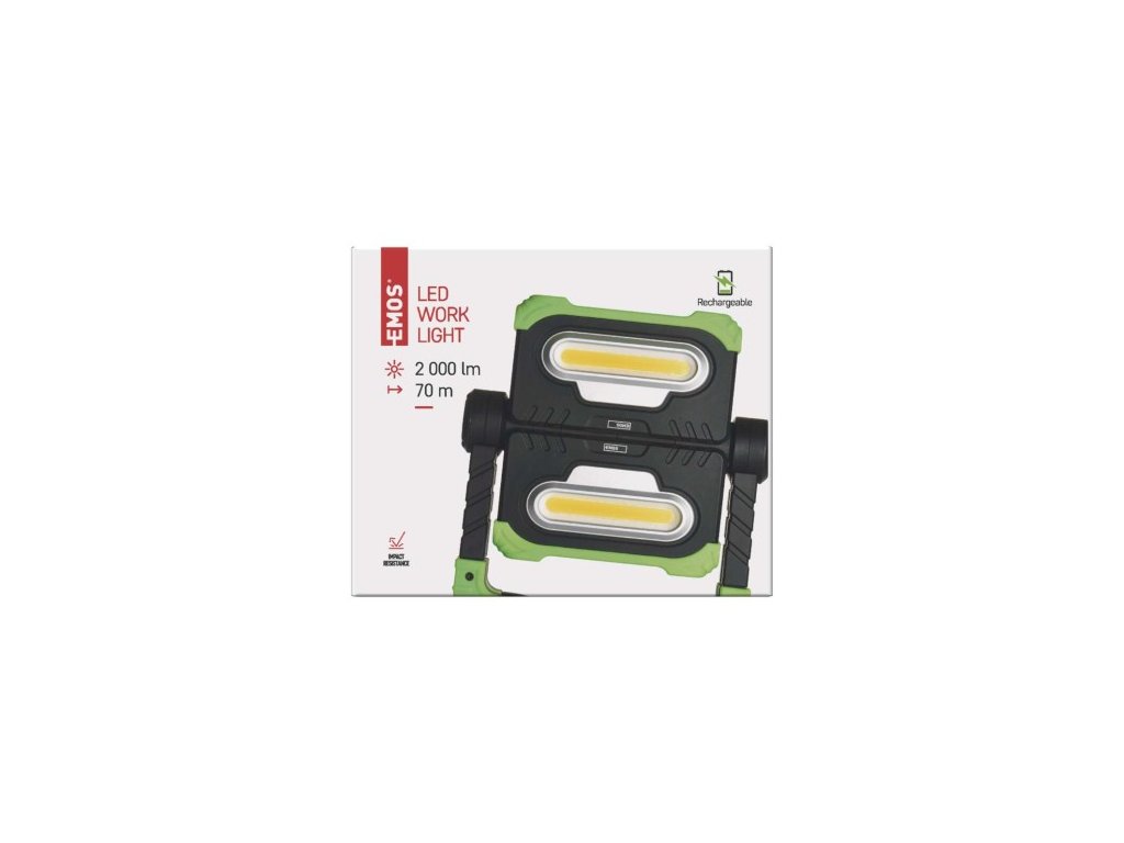 farba: čierno-zelená|batéria súčasťou balenia: áno|doba nabíjania: 7 h|doba svietenia: 3,5–14,5 h|doba svietenia detail: 2× COB LED 100 % – 3,5 h, 2× COB LED 50 % – 5,5 h, 1× COB LED 10 8,5 h, 1× COB LED 25 % – 14,5 h|dosvit: 2× COB LED 100 % – 70 m, 2× COB LED 50 % – 45 m, 1× COB LED 100 % – 45 m, 1× COB LED 50 % – 35 m, ne|hmotnosť: 818 g|LED indikácia nabíjania: áno|LED indikácia stavu akumulátora: áno|materiál: ABS plast + guma|maximálny dosvit: 70 m|maximálny svetelný tok: 2 000 lm|nabíjací: áno|napájanie: Li-Ion akupack|nárazu 5|príslušenstvo: USB kábel|predajný obal: 1 ks, krabica|režimy svietenia: 2× COB LED 100%, 2× COB LED 50%, 1× COB LED 100%, 1× COB LED 50%, 1× COB LED 25% | rozmer: 214 funkcia rýchleho vypnutia, funkcia ochrany batérie|svetelný tok: 2× COB LED 100 % – 2 000 lm, 2× COB LED 50 % – 1 000 lm, 1× COB LED 100 % – 1 000 lm, 1× COB LED 50 % – 500 lm, 2× COB LED 50 % – 500 lm batérie: 8 000 mAh/3,7 V|typ napájacieho konektora: USB C|vodeodolnosť: ne|vybavenie: otočná rukoväť, 4× magnet|záručná doba: 2 roky|zdroj svetla: 2× COB LED|značka: EMOSDodatočné parametre