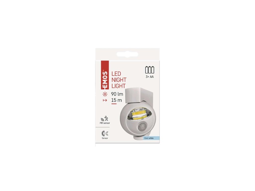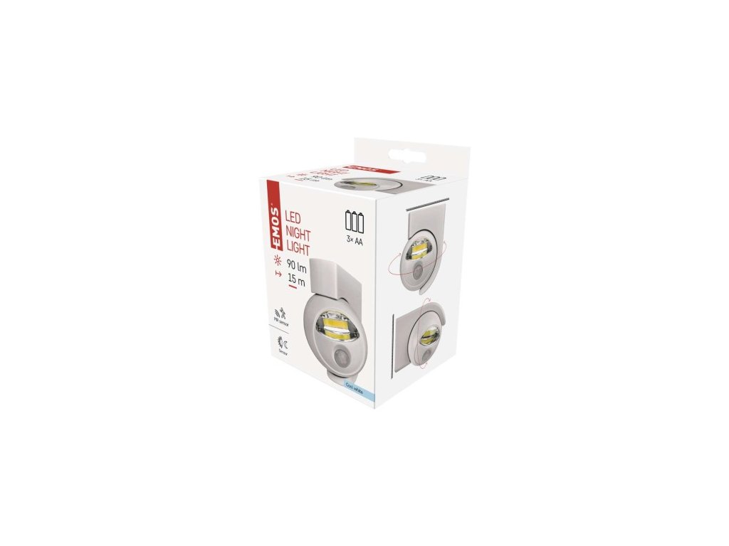 automatické zapnutie/vypnutie: áno|farba svetla: studená biela|časové oneskorenie: 25 sekúnd +/- 5 sekundy|fotosenzor: áno|maximálny dosvit: 15 m|maximálny svetelný tok: 90 lm|max. výstup 1× USB: neuvádza sa|max. výstup celkom: neuvádza sa|napájanie: 3× 1,5 V AA|natáčanie: 360°|ochrana proti preťaženiu, prepätiu a skratu: neuvádza sa|počet USB výstupov: neuvádza sa|pohybové čidlo: áno|predajný obal: 1 ks, krabica|režim svietenia: on/off mm|vypínač: áno|zdroj svetla: COB LEDDodatočné parametre