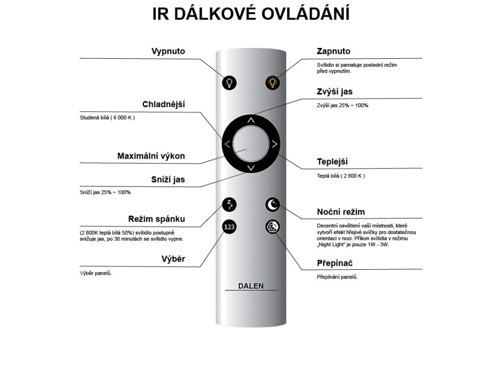 - Závesné LED svietidlo & DALEN si pamätá posledné nastavenie svetelného režimu (jas a teplotu farby svetla) aké bolo pred posledným vypnutím.