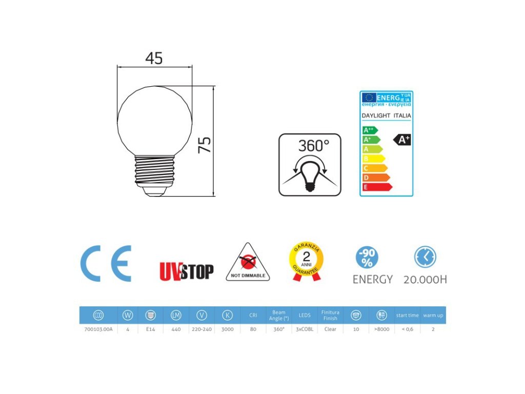Inovatívne Led žiarovka s lineárnym COB Led chipom. Prevádzková teplota: -20°C~+50°C. Široký svetelný výstup. Pekný vzhľad 100%, rovnaký ako klasické žhaviace žiarovky. Dlhá životnosť. Nízka teplota povrchu žiarovky. Vysoká úspora energie. Vákuové prostredie.