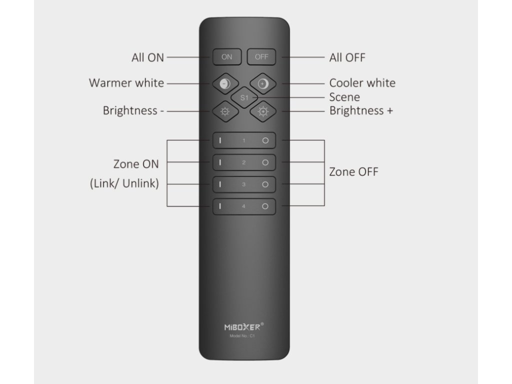 Diaľkový ovládač Mi-light - 4 kanály, jednofarebné + CCT, 2.4GHz, C1