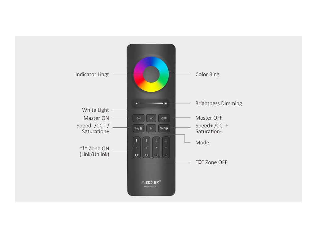 Diaľkový ovládač Mi-light - 4 kanály, RGB+CCT, 2.4GHz, C5