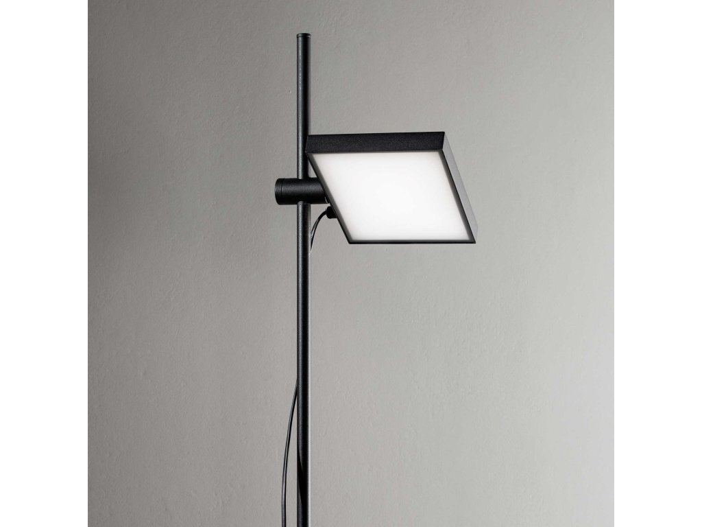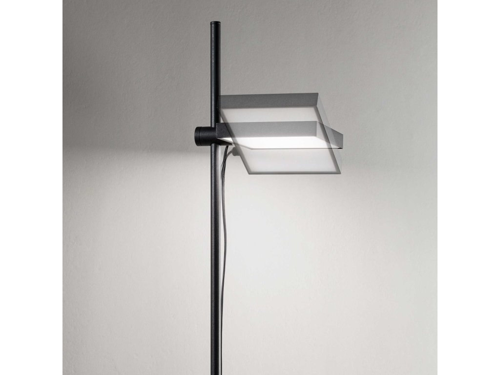Matne lakovaný kovový rám. Výškovo nastaviteľný a nastaviteľný difúzor z opálového polykarbonátu. PVC kábel s ovládačom a podlahovým spínačom. Povrchová úprava: biela, čierna.