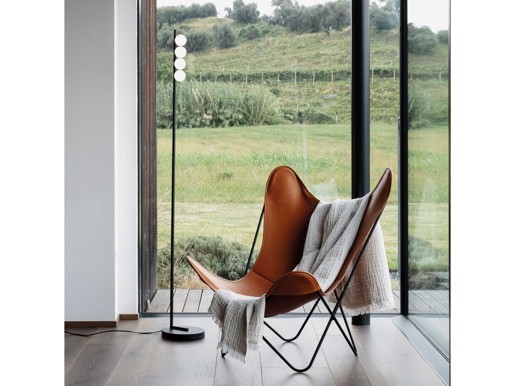 Kovový rám s povrchovou úpravou práškovým lakom. Difúzory s matnými priehľadnými akrylovými guľami. Integrovaný ovládač. PVC kábel s vypínačom. Povrchová úprava: biela, čierna, kartáčovaná mosadz.