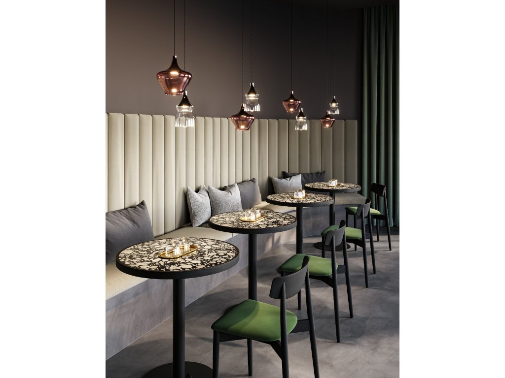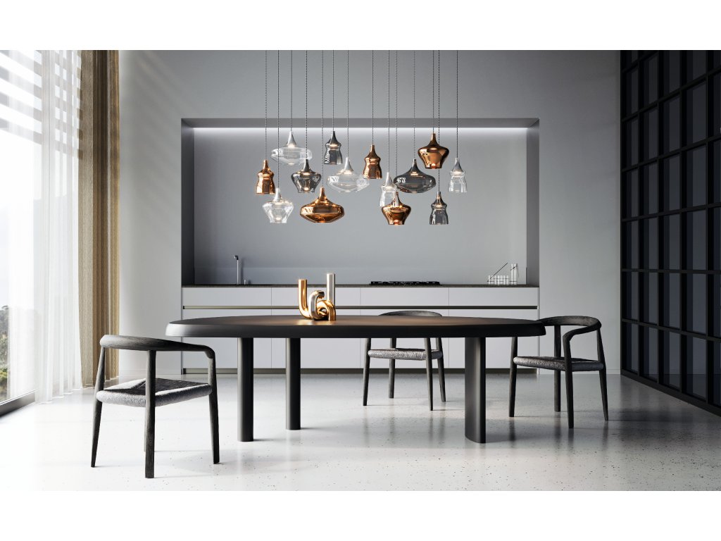 Každý detail tejto lampy je premyslený – od precízne vyfúkaného skla až po päť sofistikovaných farebných prevedení, ktoré dodajú interiéru vycibrený vzhľad ako cez deň, tak po rozsvietení. Dostupná je vo variante s čiernym rámom a káblom, alebo v kombináciichróm a transparentný kábel, čo umožňuje široké možnosti personalizácie.