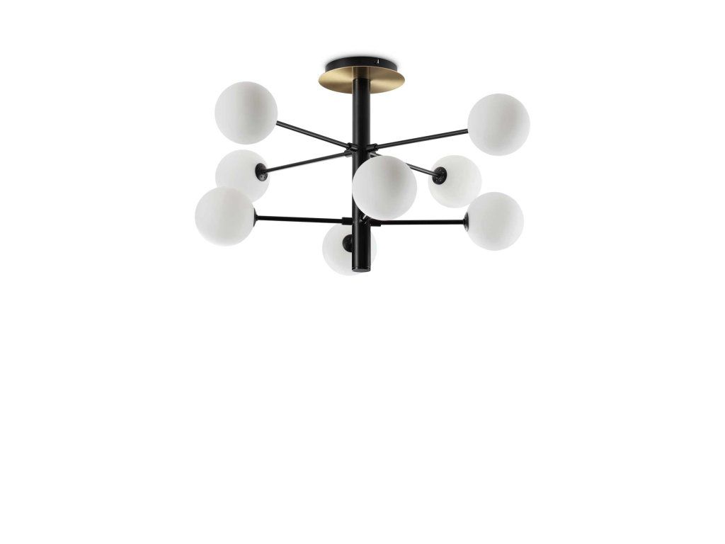 Kovový rám s povrchovou úpravou matným lakom. Difúzory z bieleho fúkaného skla leptaného kyselinou. Farby: čierna so saténovými mosadznými detailmi.