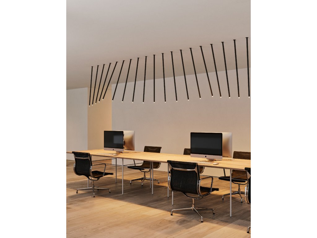 Každé svetlo je jemne zavesené na tenkom kábli, čím sa z neho stávavizuálne ľahký objekt, Ktorý pôsobí takmer nehmotne, a pritom ponúka svetelný výkon s dôrazom na estetiku aj funkčnosť.