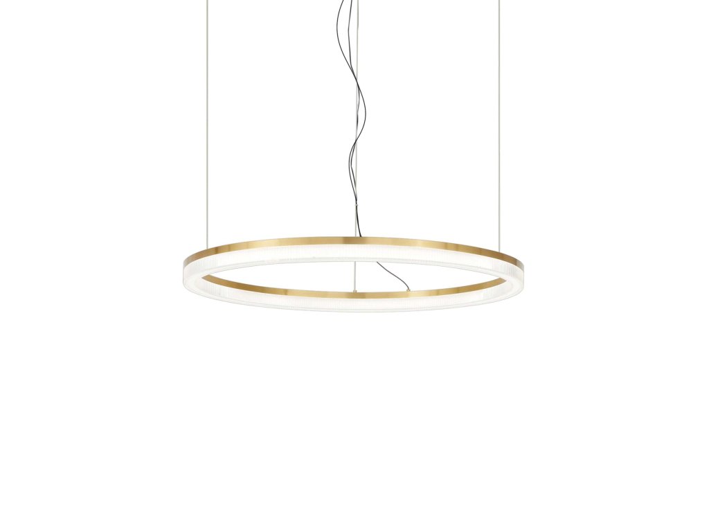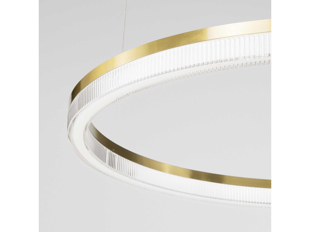 Kovová rozeta a rám s povrchovou úpravou z brúsenej mosadze. Čierny PVC kábel. Opálový akrylový difúzor s priehľadným akrylovým dekoratívnym prvkom s efektom brúseného krištáľu.