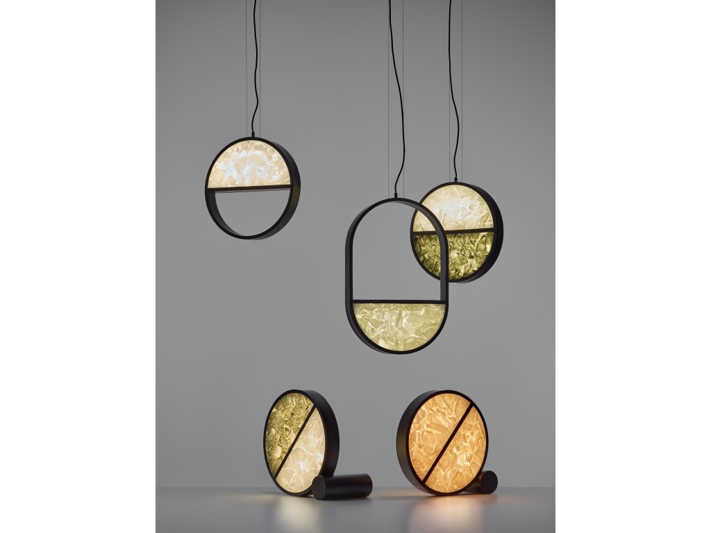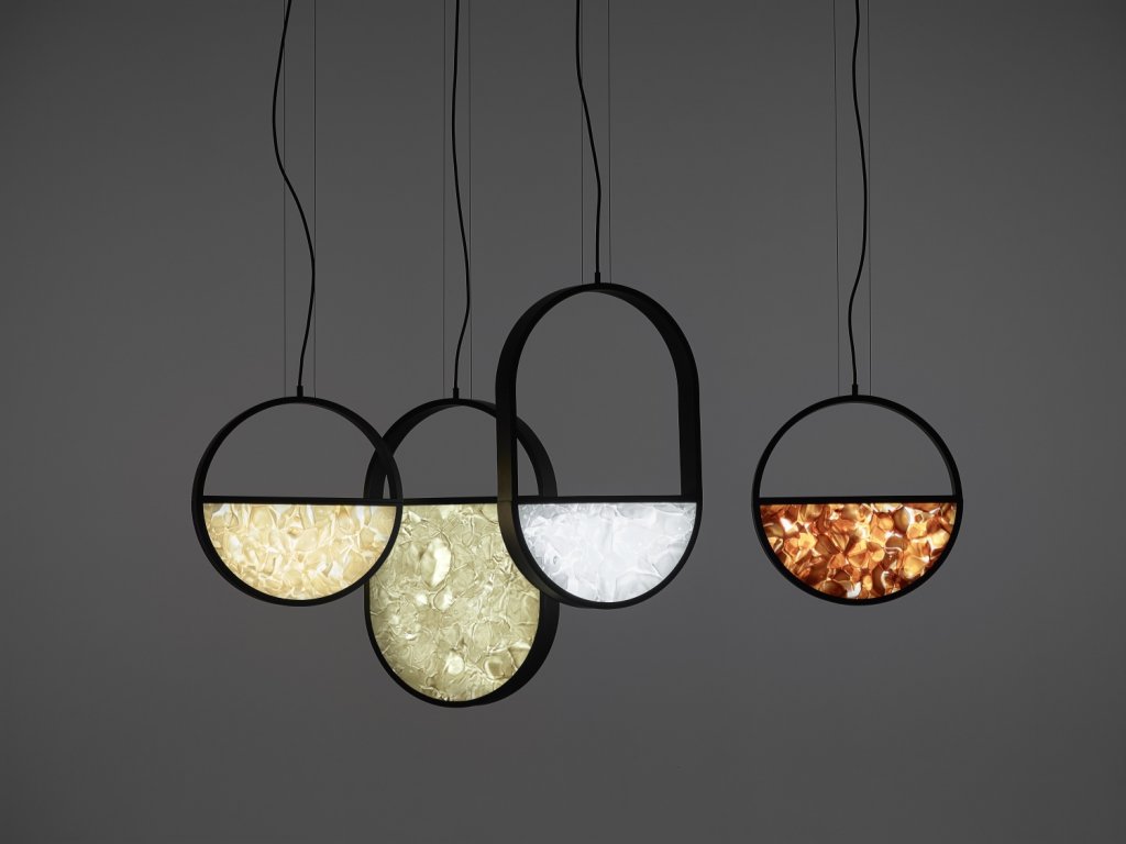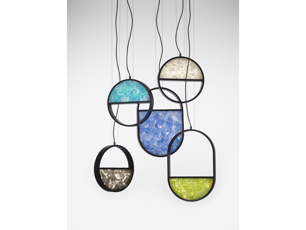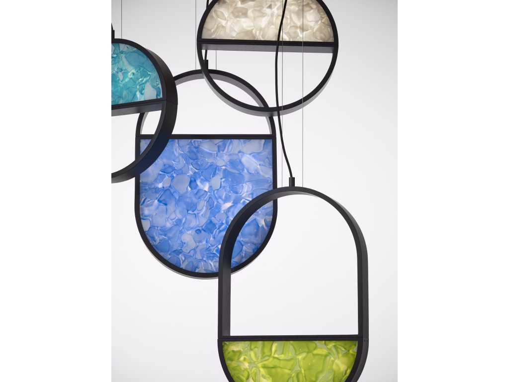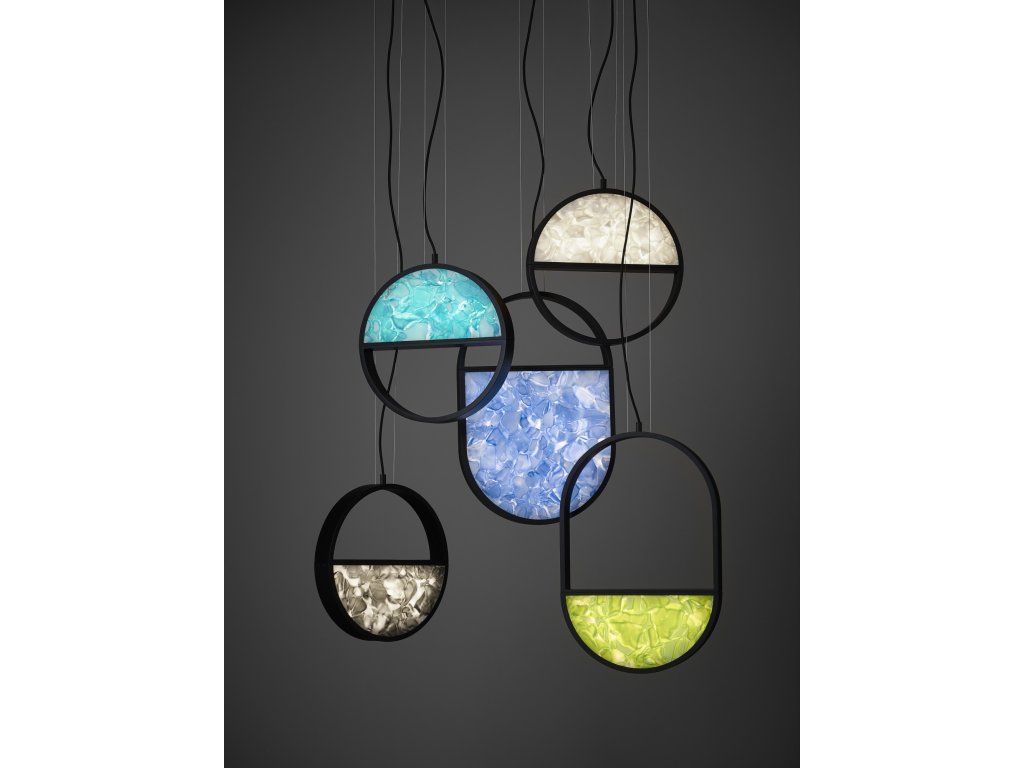 Svietidlo Geometric je zasadené do kovového rámu, do ktorého je obojstranne pripevnené sklo Brokisglass. Vnútri rámu sú vsadené LED moduly na 24VDC s optickými prvkami, ktoré umožňujú rovnomerný rozptyl svetla po celej ploche skla. Svietidlo je zavesené pomocou dvoch oceľových laniek k stropnému baldachýnu, v ktorom je uložená elektronika. Kolekcia umožňuje, aby boli svetlá usporiadané do veľkého množstva rôznych tvarov - kruhových a oválnych - buď ako solitérne svetlá, alebo ako zostavy. Pri tomto variante je spodná časť svietidla osadená sklom a je možné ľubovoľne vybrať jej farbu, vrchná časť je prázdna.
