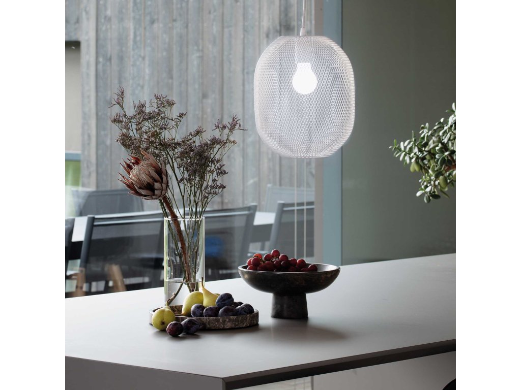 Závesné svietidlo NET s matne lakovanou kovovou rozetou. Kábel svietidla z PVC. Povrchová úprava v bielej, čiernej a zlatej farbe. Svietidlo je vhodné do obývacej izby či jedálne.