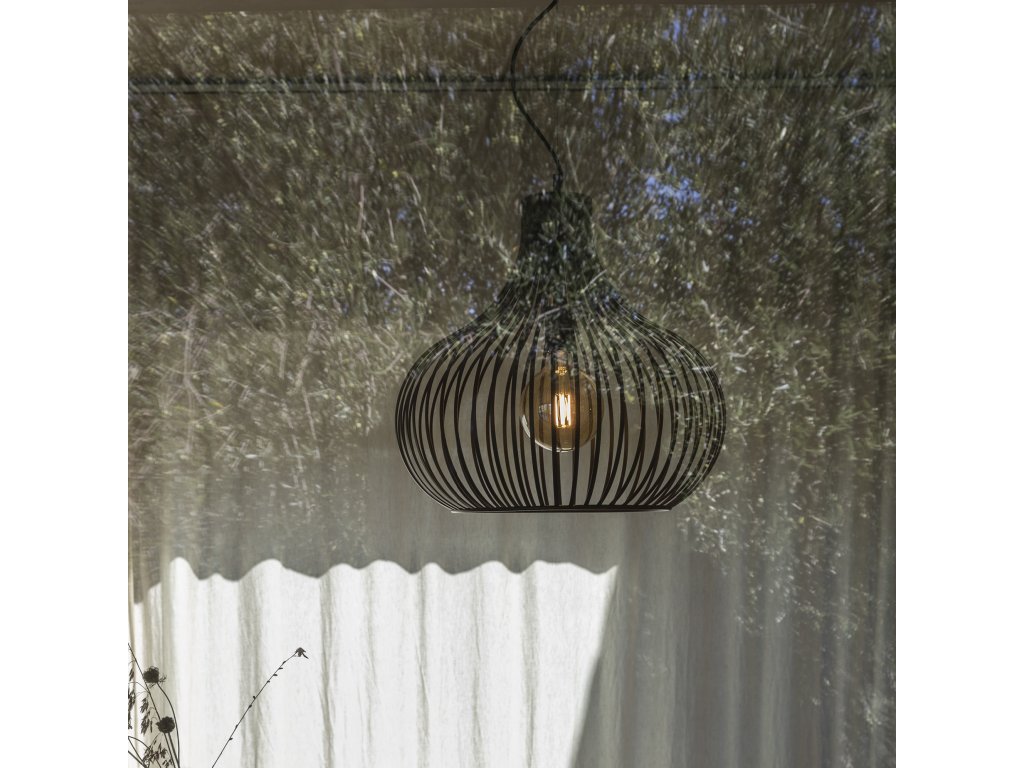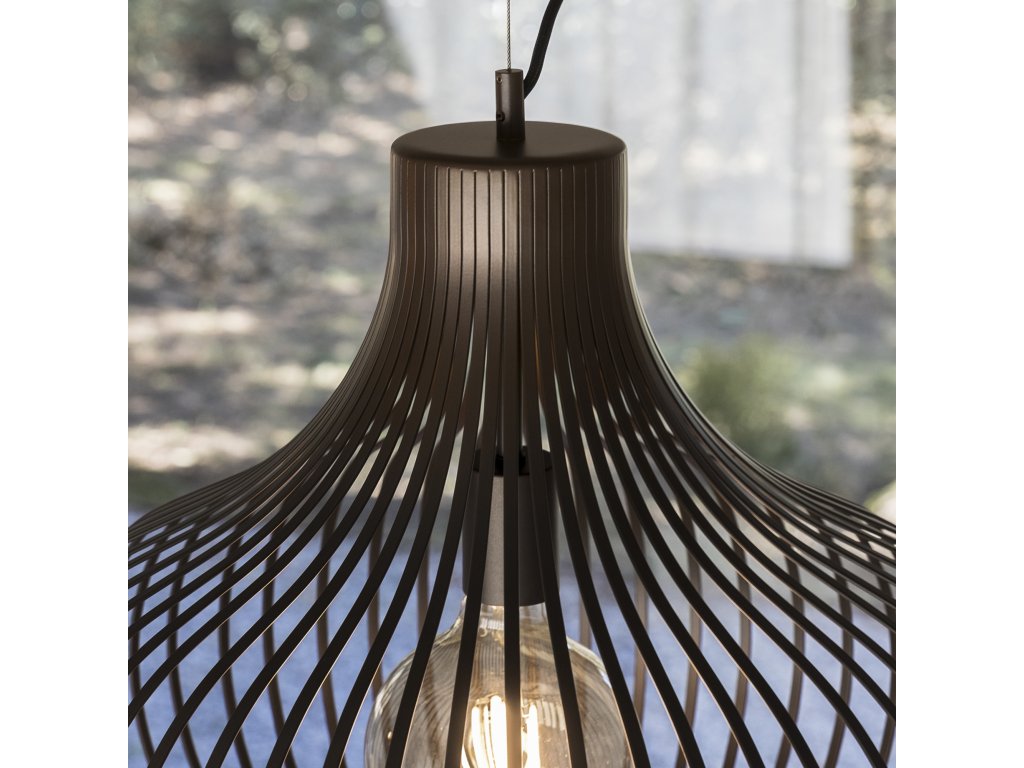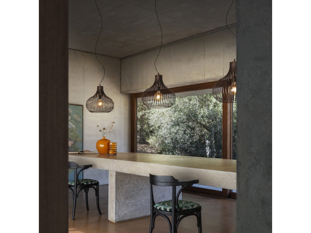 Luster je vyrobený z kovu v matne hnedom prevedení. Prívodný kábel je potiahnutý textilným poťahom v rovnakom odtieni. Difúzor je tvorený plochými kovovými pásikmi. Aj napriek tomu, že je veľmi luster nenápadný, vyzerá krásne ako rozsvietený, tak zhasnutý.