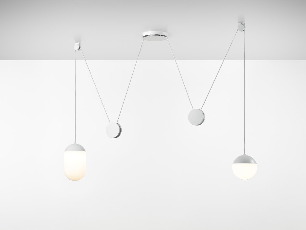 Pod tienidlom z matného skla je umiestnený okrúhly LED panel, ktorý skrýva vnútorné časti a zachováva tak siluetu svetla. Kovové komponenty sú taktiež v matnom prevedení a sú kombinované s textilnou šnúrou pre jednotný vzhľad. Farebnosť je vždy monochromatická, aby podčiarkla grafický charakter svietidiel, tienidlá skla sú v tvare – gule, kužeľa alebo kapsule.