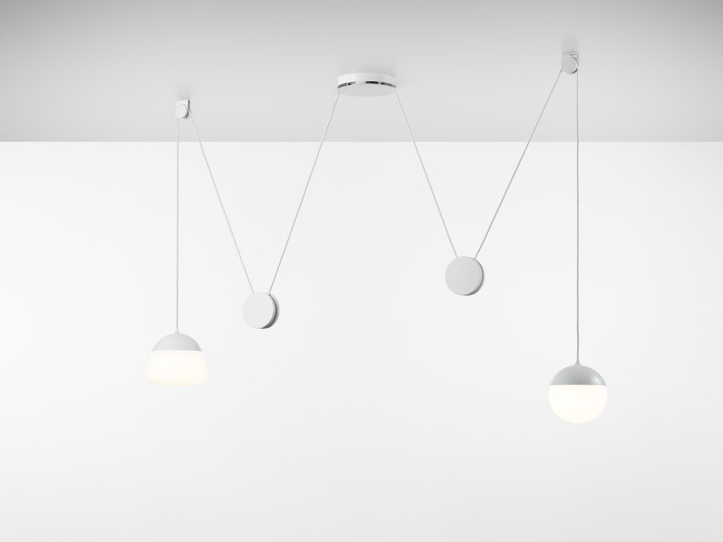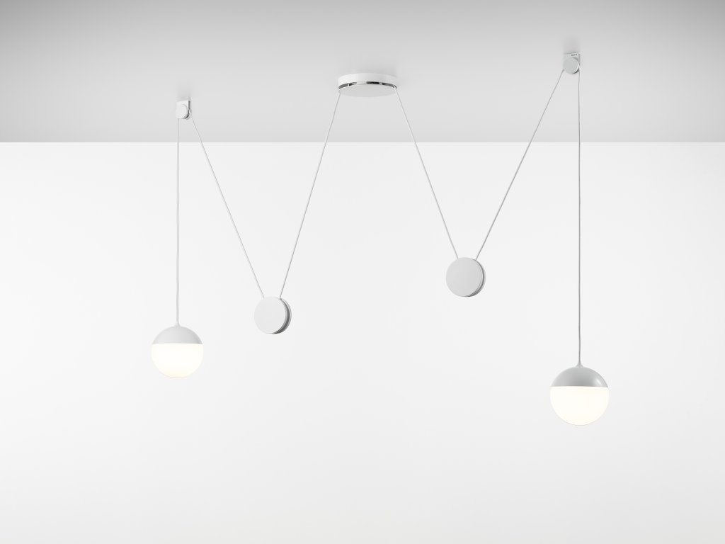 vyvážená závažím. Vďaka tomuto systému je možné variabilné nastavovanie výšky jednotlivých ramien. Každé rameno je zostavené z prívodného kábla, kovovej krytky, LED modulu a skleneného tienidla.