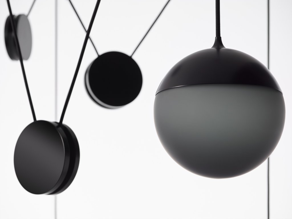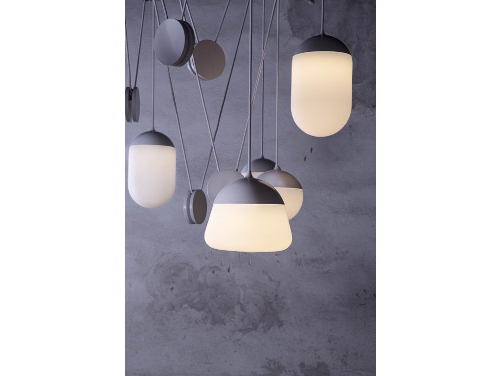Pod tienidlom z matného skla je umiestnený okrúhly LED panel, ktorý skrýva vnútorné časti a zachováva tak siluetu svetla. Kovové komponenty sú taktiež v matnom prevedení a sú kombinované s textilnou šnúrou pre jednotný vzhľad. Farebnosť je vždy monochromatická, aby podčiarkla grafický charakter svietidiel, tienidlá skla sú v tvare – gule, kužeľa alebo kapsule.