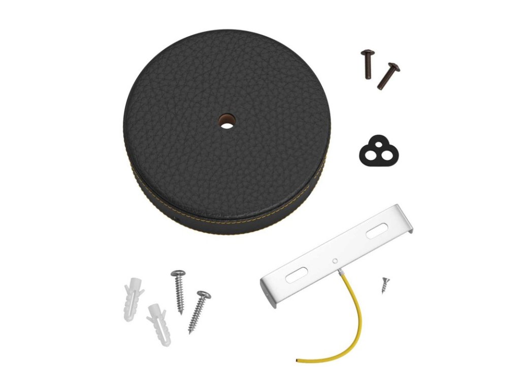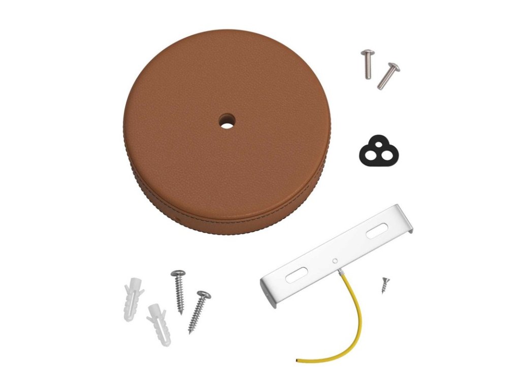 UPOZORNENIE: Elektrické svorky pre zapojenie stropného baldachýnu k elektrickému vedeniu NIE JE SÚČASŤOU balenia, ale je možné ich zakúpiť samostatne. Drevený stropný baldachýn potiahnutý kožou pre textilné káble.