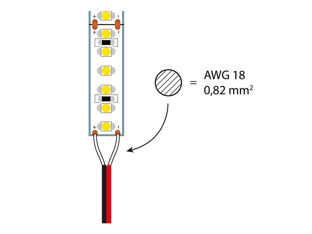 2-žilový kábel od McLED s vodičmi AWG 18. Kábel obsahuje dva medené vodiče - červený a čierny s prierezom 0,8 mm². Používa sa na pripájanie a prepájanie double jednofarebných LED pásikov. Pri zapojení voľte maximálnu dĺžku a vhodný prierez vodiča vždy s ohľadom na prípustný úbytok napätia, ktorý na vodiči vzniká priechodom prúdu.