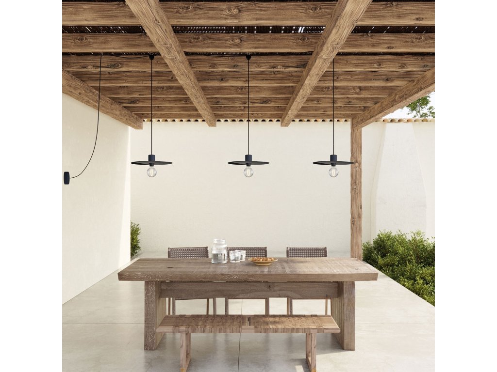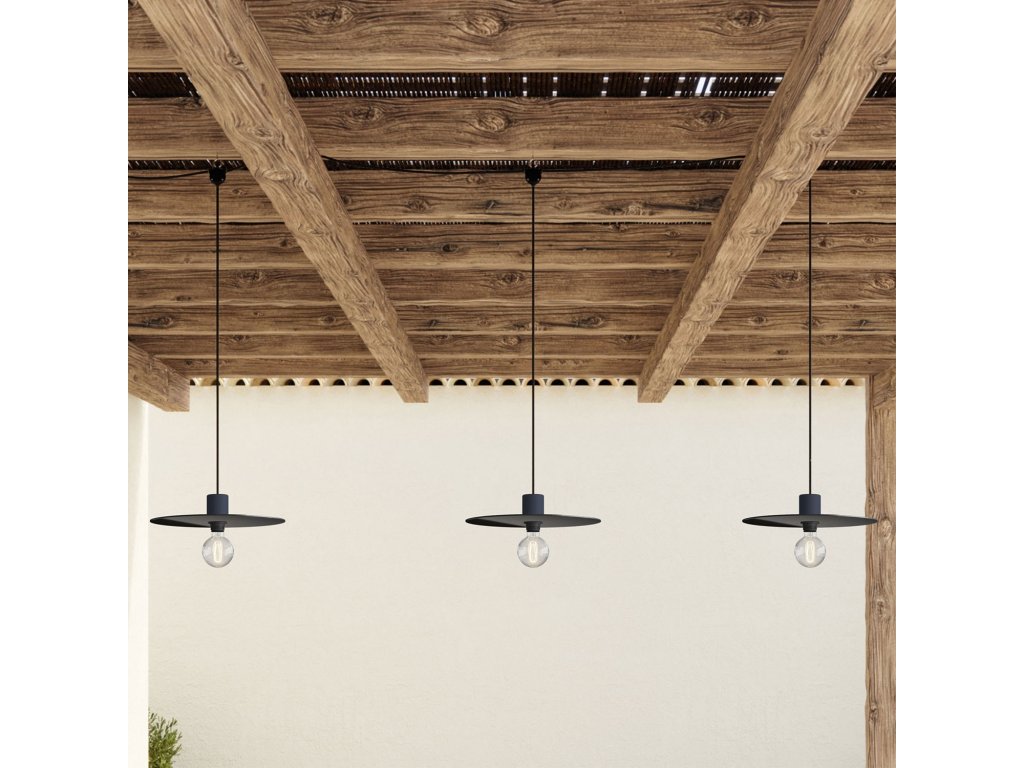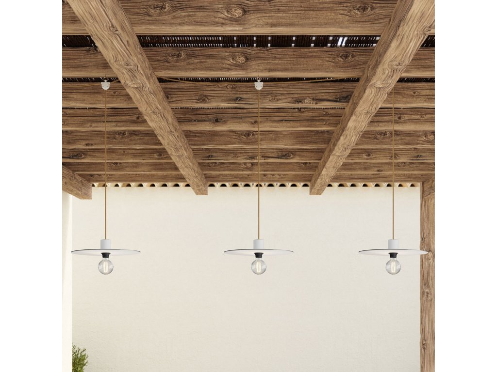 Vytvorená so slušivými kovovými tienidlami s dotykom retro, táto vonkajšia lampa talianskej výroby s tromi závesmi so svetlami nie je len skvelá na pohľad, ale aj ideálna v riešení osvetlenia vašej záhrady, dvorku alebo terasy, bez obáv z letných búrok. Objímky, baldachýny a spojky so stupňom krytia IP65 sú spolu s neoprénovými káblami a tienidlami súčasťou osvetľovacieho systému EIVA, navrhnutého spoločnosťou Creative-Cables, aby lepšie odolával počasiu a ďalším vplyvom prostredia. Upozornenie: Stupeň ochrany IP65 je zaručený iba so žiarovkami v tvare A60, ST64, G95 a G125 (neustále sa aktualizujú) a objímka EIVA je navrhnutá výhradne pre uchytenie sklenených LED žiaroviek. Tieto lampy patentované spoločnosťou Creative-Cables sú navrhnuté a zostavené v Taliansku. Sú testované a certifikované CE nezávislými zariadeniami na základe prísnych noriem.