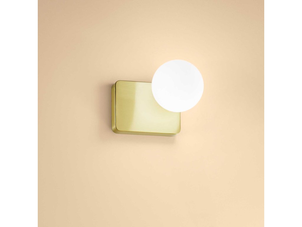 Kovový rám. Difúzory z bieleho fúkaného skla leptaného kyselinou so skrutkovým upevnením. Povrchová úprava: kartáčované zlato.