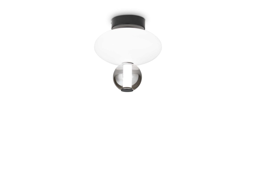 Matne čierno lakovaný kovový rám s bielym difúzorom a šedým fúkaným skleneným dekoratívnym prvkom. Svietidlo je vhodné do spálne alebo obývačky.