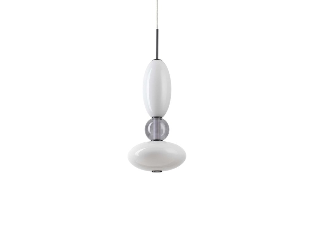 Matne čierno lakovaný kovový rám s bielym difúzorom a šedým fúkaným skleneným dekoratívnym prvkom. Svietidlo je vhodné do jedálne alebo obývačky.