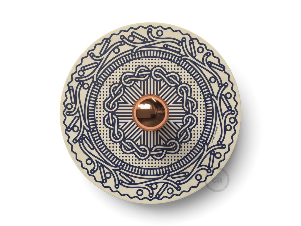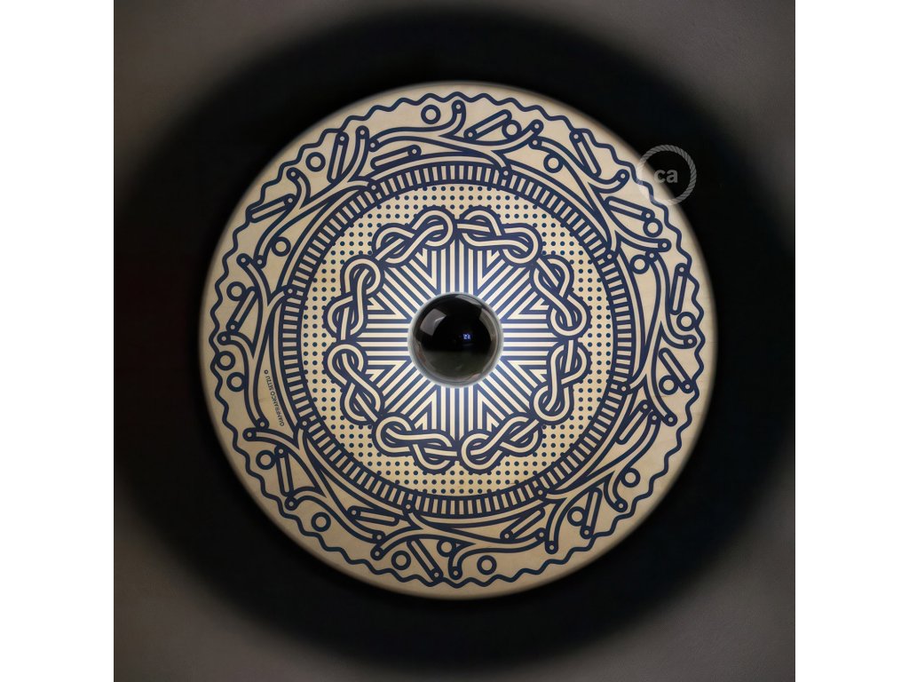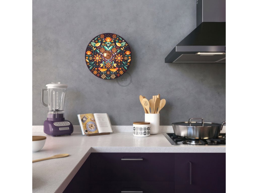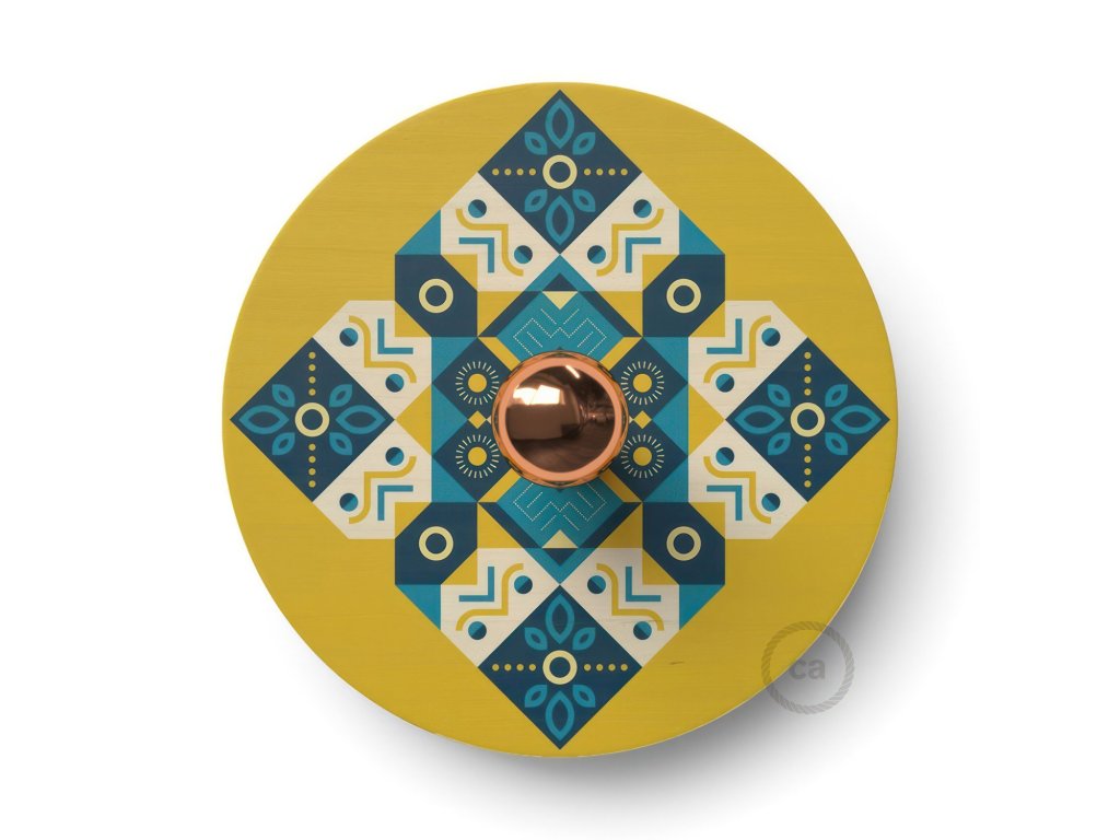 Svietidlo Fermaluce Ethnic s obojstranným ilustrovaným diskom z UFO kolekcie vzniklo zo spolupráce medzi Creative-Cables a najsľubnejších talianskych ilustrátorov v priebehu FuoriSalone a Milan Design Week 2018. Jedná sa o nástenné alebo stropné bodové svetlo s veľkým dekoratívnym potenciálom. Je schopné vylepšiť stenu rovnako ako zarámovaná fotka alebo maľované plátno. Ak chcete zmeniť vzhľad svojho Fermaluce, stačí otočiť disk: obe strany sú ilustrované! Drevený disk z topoľa je doplnený o biele svietidlo a striebornú objímku s päticou E27. Odporúčame vám vybrať si zdroj svetla LED s tmavou pologuľou A60, ktorá nezakrýva ilustrácie a sústredí svetlo na kresbu bez oslnenia pozorovateľa.