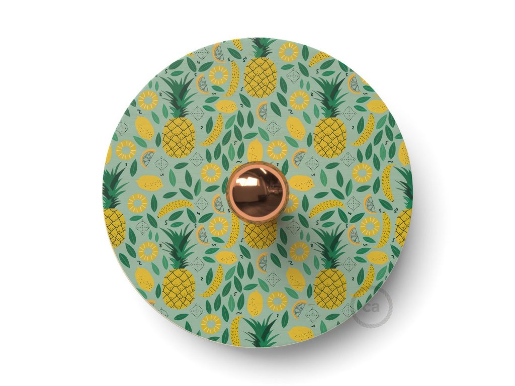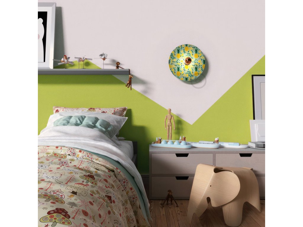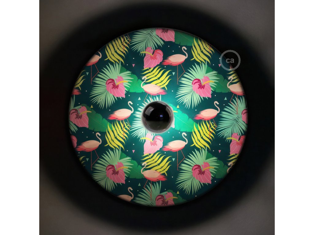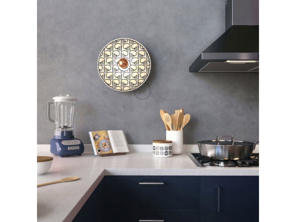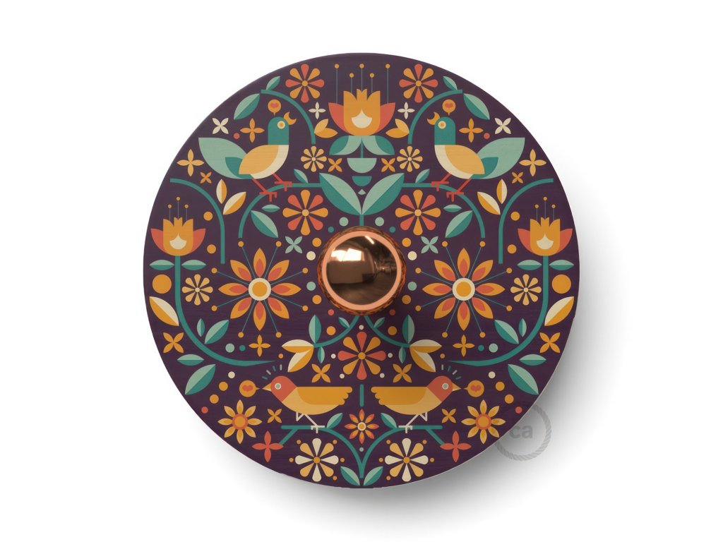 Svietidlo Fermaluce Ethnic s obojstranným ilustrovaným diskom z UFO kolekcie vzniklo zo spolupráce medzi Creative-Cables a najsľubnejších talianskych ilustrátorov v priebehu FuoriSalone a Milan Design Week 2018. Jedná sa o nástenné alebo stropné bodové svetlo s veľkým dekoratívnym potenciálom. Je schopné vylepšiť stenu rovnako ako zarámovaná fotka alebo maľované plátno. Ak chcete zmeniť vzhľad svojho Fermaluce, stačí otočiť disk: obe strany sú ilustrované! Drevený disk z topoľa je doplnený o biele svietidlo a striebornú objímku s päticou E27. Odporúčame vám vybrať si zdroj svetla LED s tmavou pologuľou A60, ktorá nezakrýva ilustrácie a sústredí svetlo na kresbu bez oslnenia pozorovateľa.