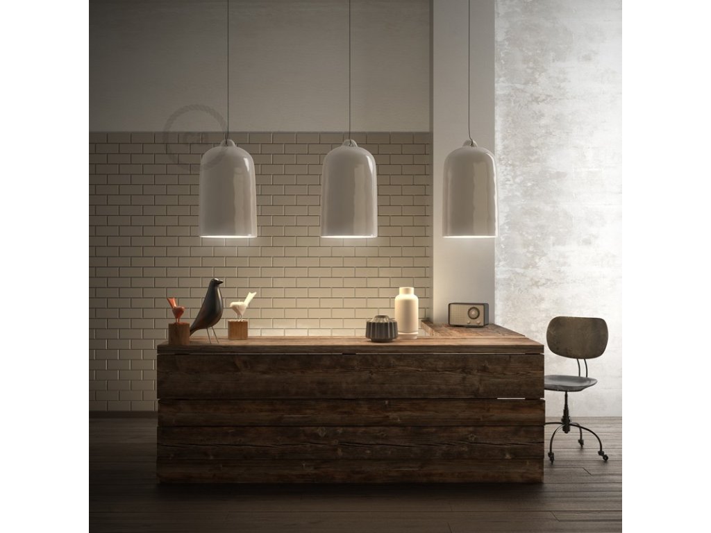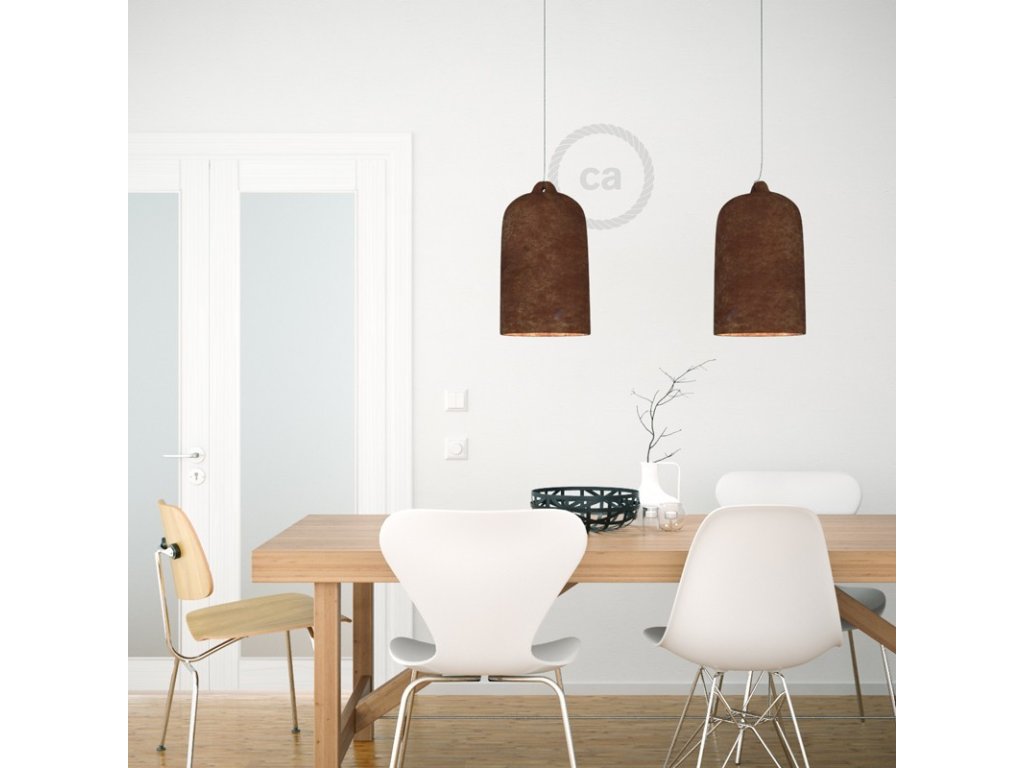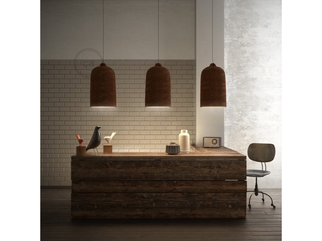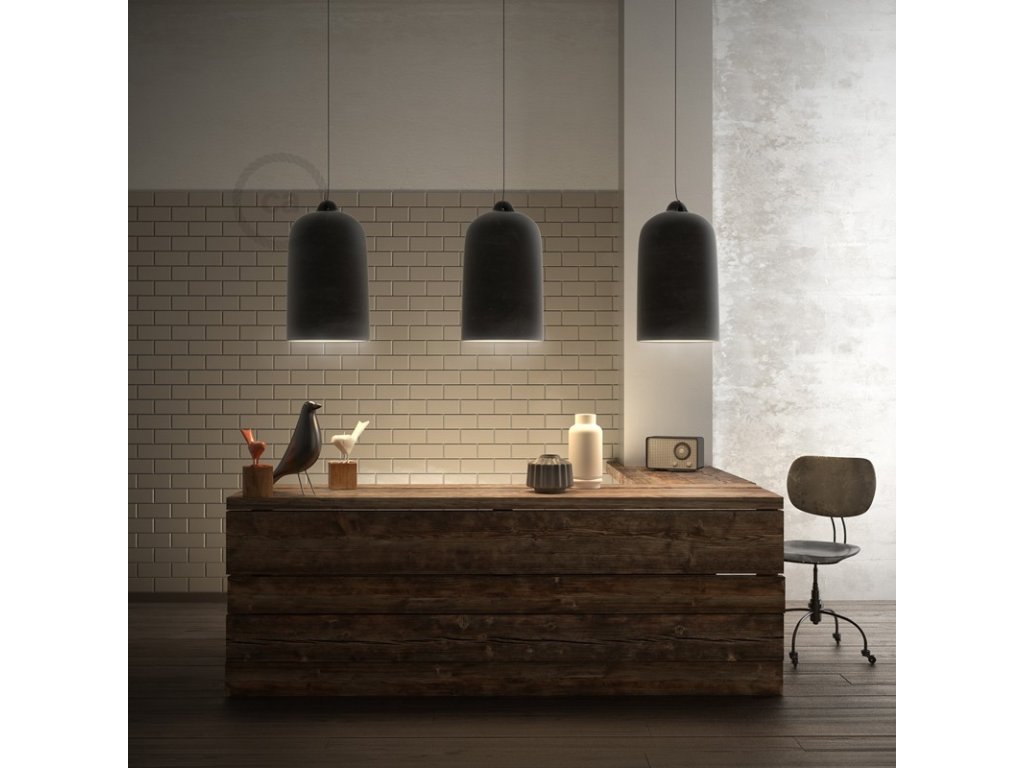 Vytvorte si elegantné a pôsobivé závesné svietidlo s tienidlom Zvon XL. Ideálne umiestnenie tohto tienidla je nad stolom alebo barovým pultom, kde vynikne jeho vzhľad a ohromné rozmery. Toto výnimočné tienidlo je kompletne vyrobené v Taliansku. Tienidlo Zvon XL má jednoduchú montáž: stačí omotať textilný kábel okolo závesného očka tienidla, na koniec kábla pripojiť E27 objímku a do nej naskrutkovať dizajnovú žiarovku, ktorú ste si vybrali pre svoje závesné svietidlo. Každé farebné prevedenie tohto tienidla je navrhnuté tak, aby nejakým spôsobom vystihovalo a dopĺňalo určitý štýl interiéru. Hladká biela pre čistý elegantný efekt, čierna tabuľová farba pre originálny vzhľad svietidla, alebo v súčasnosti najoriginálnejšie prevedenie - s efektom hrdze a betónu - ideálne do industriálne ladených interiérov.