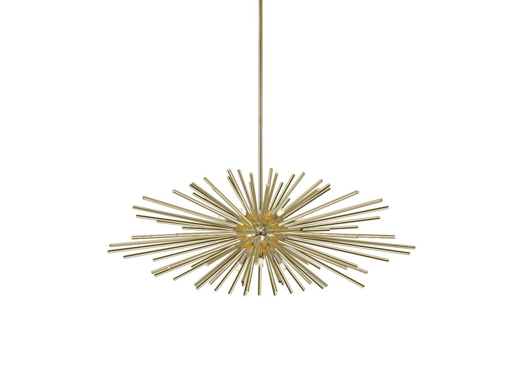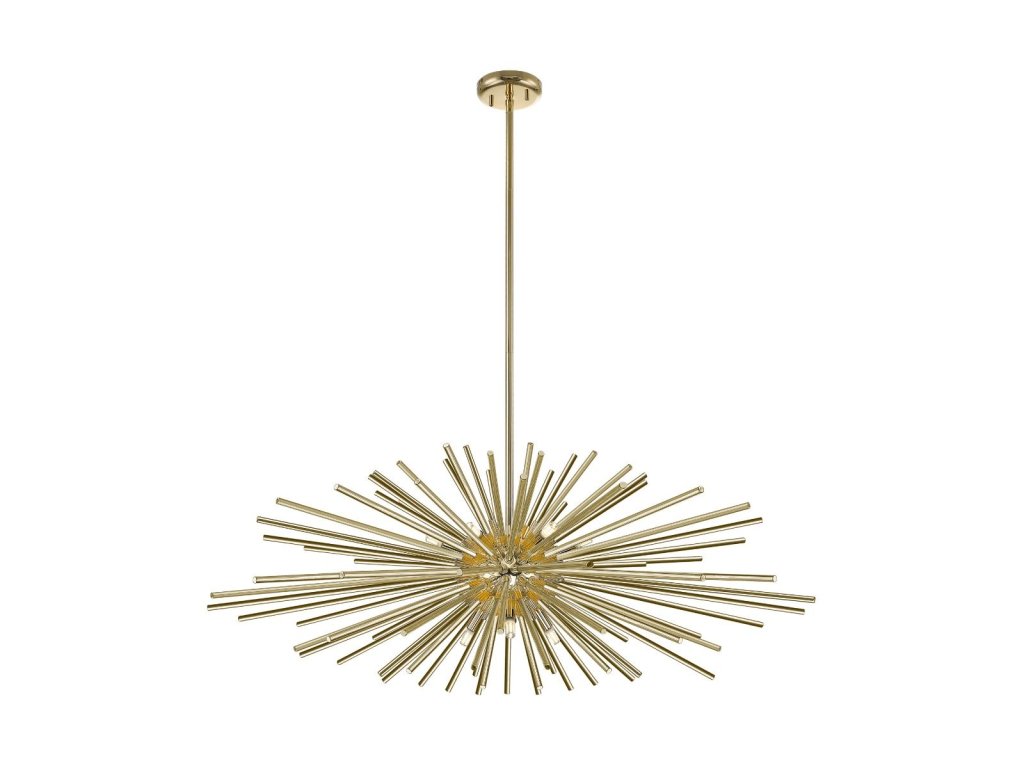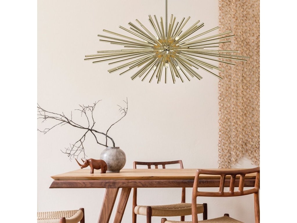 Kovové, závesné svietidlo od Zuma Line zo série Urchin, je vhodným doplnkom do moderného interiéru. Toto svietidlo je vyrobené z kovu a má priemer 101 cm. Svietidlo sa vyrába aj v stropnej verzii. Farebné prevedenie zlatá. Hodí sa ako osvetlenie obývacej priestoru, hotelovej izby či reštaurácie.