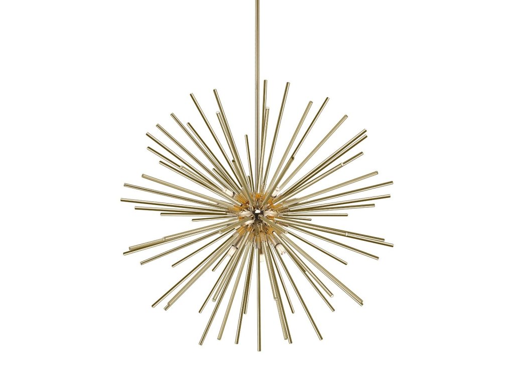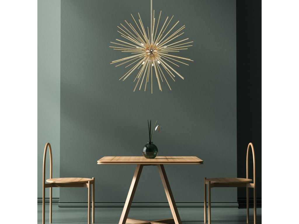 Kovové, závesné svietidlo od Zuma Line zo série Urchin, je vhodným doplnkom do moderného interiéru. Toto svietidlo je vyrobené z kovu a má priemer 78 cm. Svietidlo sa vyrába aj v stropnej verzii. Farebné prevedenie zlatá. Hodí sa ako osvetlenie obývacej priestoru, hotelovej izby či reštaurácie.