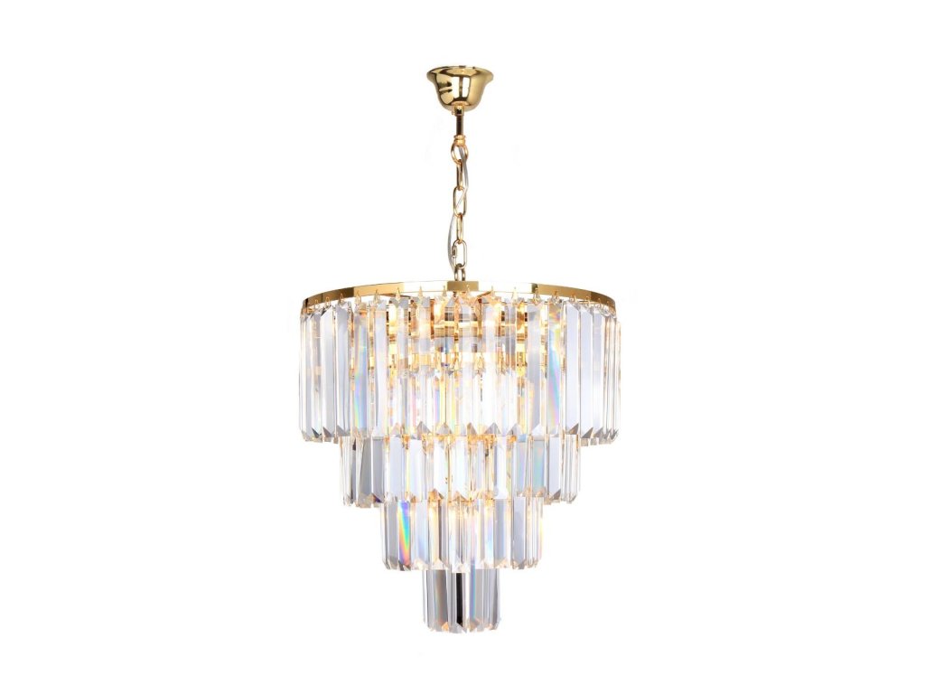 Krištáľové, závesné svietidlo od Zuma Line, Amedeo je vhodným doplnkom do moderného interiéru. Toto svietidlo je vyrobené z krištáľu, kovu a skla s priemerom 38 cm. Sklenené kryštály sú v 4 kruhoch v kaskádovom zavesení.