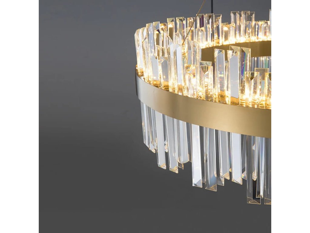 Moderný krištáľový luster z kolekcie krištáľových svietidiel Crystal. Táto kolekcia sa vyznačuje neobvyklými tvarmi, ktoré si ale zachovávajú eleganciu s využitím kovových a krištáľových prvkov najvyššej kvality s trojuholníkovým prierezom. Ide o číry krištáľ triedy K9. V tejto sérii nájdete aj nástenné svietidlo.