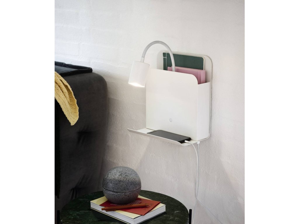 Nástenné svietidlo Roomi je vybavené priehradkou na časopisy a praktickou policou, do ktorej sa zmestia vaše najdôležitejšie nevyhnutnosti.