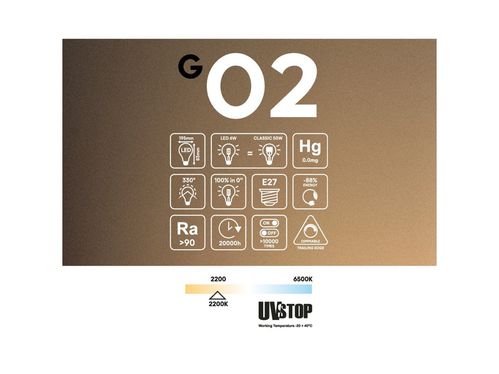 Žiarovka G02 využíva technológiu LED av porovnaní s tradičnými žiarovkami poskytuje výraznú energetickú účinnosť. Okrem toho ponúka predĺženú životnosť výrobku cez 20 000 hodín a vysoký index podania farieb (CRI) 90 zaisťuje jasné a živé osvetlenie, ktoré vám umožní udávať tón v akomkoľvek prostredí.