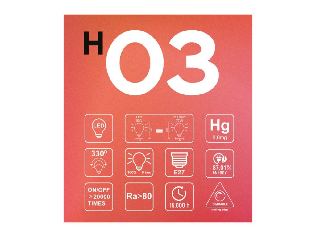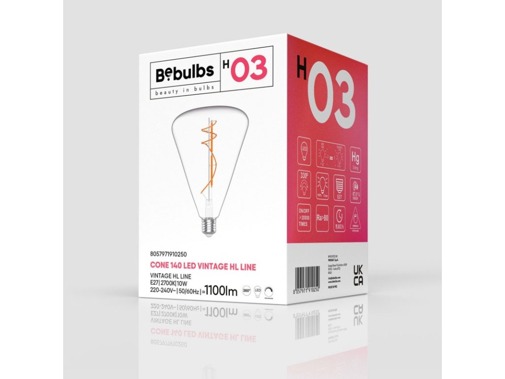 H03 Kužeľ 140 je inovatívna žiarovka kónického tvaru, ktorá v sebe spája krásu geometrickej formy a dvojitého vlákna: zakrivené pre zaujímavý a pozoruhodný vzhľad a rovné pre lepší svetelný výkon. Táto značková dizajnová žiarovka Bebulbs ponúka vysoký svetelný tok. Pokiaľ ide o LED žiarovky, spoločnosť Bebulbs stále posúva hranice dizajnu, aby dosiahla mimoriadnu kvalitu a pôvab. Stmievateľná žiarovka s dlhou životnosťou (15 000 hodín a 20 000 cyklov zapnutia/vypnutia). Číre sklo jej dodáva veľkorysosť a eleganciu, žiarovka je tiež mimoriadne jasná (1100 lm). Perfektné pre každú príležitosť, pre komerčné i domáce použitie.