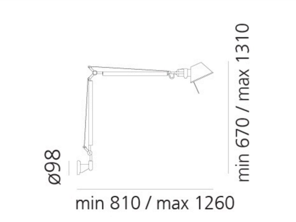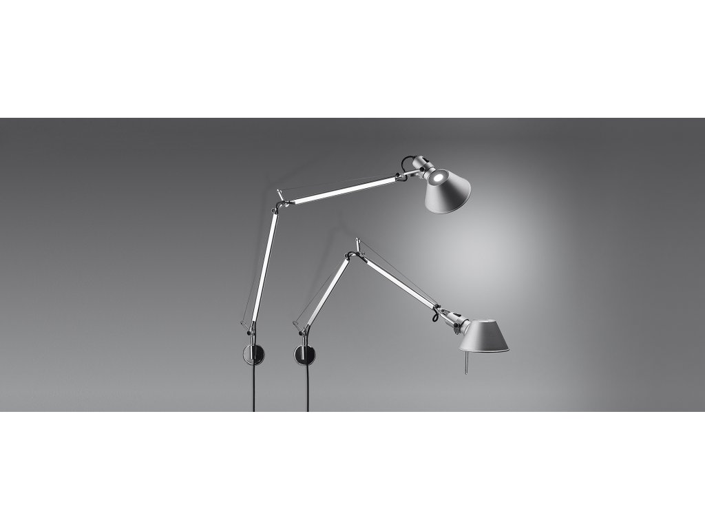 Nástenná lampa Tolomeo sa vyznačuje výrazným tenkým konzolovým ramenom, kruhovou základňou a kónickým tienidlom. Maximálna dĺžka ramena lampy je 126 cm. V kolekcii sú tiež menšie stolné lampy alebo tiež stojacie lampy. atmosféry.