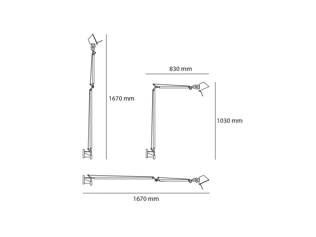 Nástenná lampa Tolomeo sa vyznačuje výrazným tenkým konzolovým ramenom, kruhovou základňou a kónickým tienidlom. Dĺžka ramena je minimálne 83 cm a maximálne 136 cm. V kolekcii sú tiež menšie stolné lampy alebo tiež stojacie lampy. atmosféry.