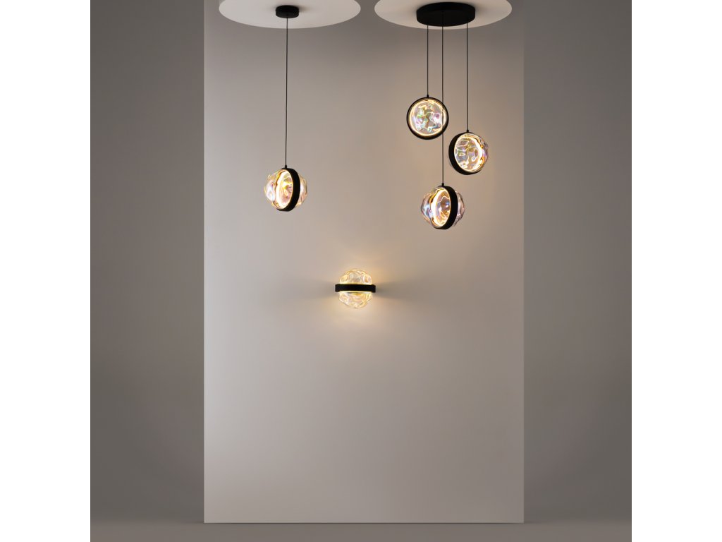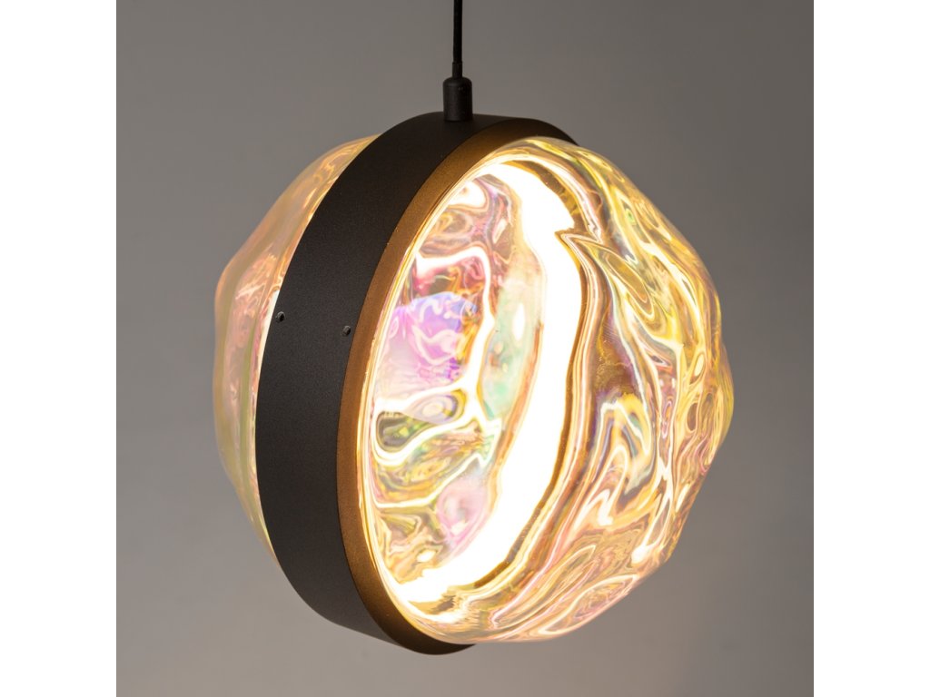 Krásne luxusné designové svietidlo od nemeckej značky Maytoni zo série MISTERIO. čiernu konštrukciu. Difúzor má nepravidelný okrúhly tvar a sklenený povrch odráža duchové odlesky.