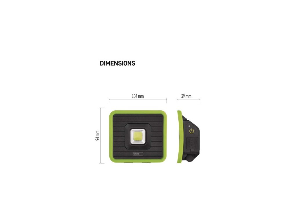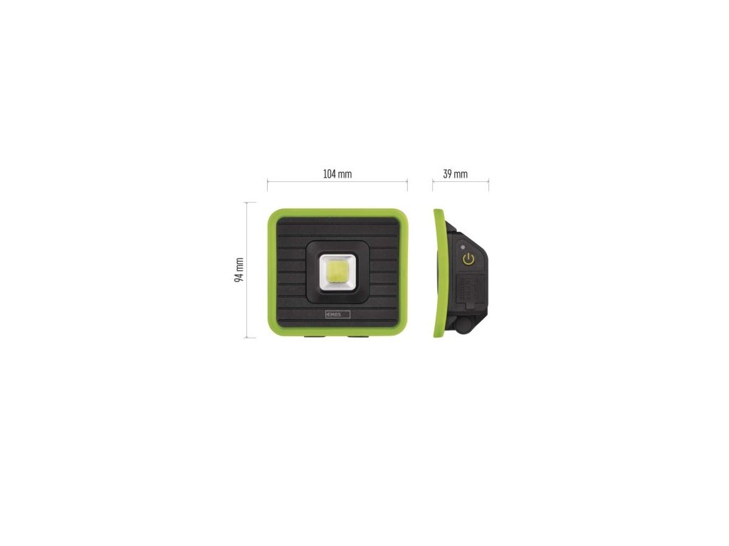 farba: čierno-zelená|batéria súčasťou balenia: áno|doba nabíjania: 3 h|doba svietenia: 3–17 h|doba svietenia detail: COB LED 100 % – 3 h, COB LED 50 % – 6 h, COB LED 25 % – 17 h | dosvit: COB LED 100 m, COB LED 25 % – 20 m|fokus: ne|hmotnosť: neuvádza sa|LED indikácia nabíjania: áno|LED indikácia stavu akumulátora: ne|materiál: ABS plast|maximálny dosvit: 40 m|maximálny svetelný tok: 1 000 lm|nabíjanie: áno| režimov svietenia: 3|príslušenstvo: USB-C kábel|predajný obal: 1 ks, krabica|režimy svietenia: COB LED 100%, COB LED 50%, COB LED 25%|rozmer: 104 × 39 × 94 mm|špeciálne funkcie: funkcia power bank, funkcia rýchleho vypnutia – 1 000 lm, COB LED 50 % – 500 lm, COB LED 25 % – 250 lm|typ batérie: 2 200 mAh/3,7 V|typ napájacieho konektora: USB C|vodeodolnosť: áno (IP44)|vybavenie: magnet, otočný 2 svetlá: COB LED|značka: EMOSDodatočné parametre