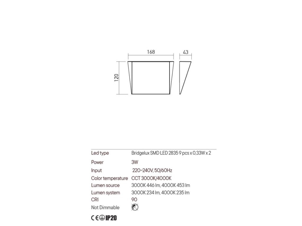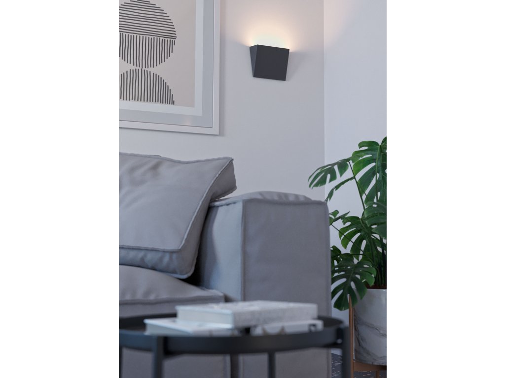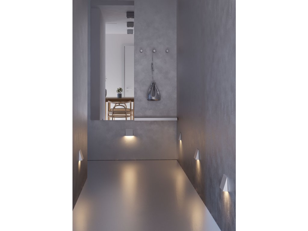Nástenné svietidlo do interiéru s nepriamym svetlom, vybavené SMD LED, možnosť voľby teploty farby svetla 3000K alebo 4000K. Lakovaná konštrukcia z tlakovo liateho hliníka k dispozícii v dvoch farebných variantoch s difúzorom z priehľadného polykarbonátu.